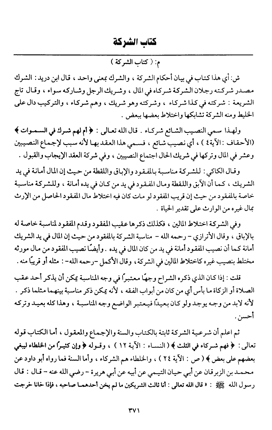 ثم اعلم أن شرعية الشركة ثابتة بالكتاب والسنة والإجماع والمعقول، أما الكتاب قَوْله تَعَالَى: {فَهُمْ شُرَكَاءُ فِي الثُّلُثِ} [النساء: 12] (النساء: الآية 12) ، وقوله {وَإِنَّ كَثِيرًا مِنَ الْخُلَطَاءِ لَيَبْغِي بَعْضُهُمْ عَلَى بَعْضٍ} [ص: 24] (ص: الآية 24) ، والخلطاء هم الشركاء، وأما السنة فما رواه أبو داود عن محمد بن الزبرقان عن أبي حيان التيمي عن أبيه عن أبي هريرة - رَضِيَ اللَّهُ عَنْهُ - قال: قال رسول الله - صَلَّى اللَّهُ عَلَيْهِ وَسَلَّمَ -: «قال الله تعالى: أنا ثالث الشريكين ما لم يخن أحدهما صاحبه، فإذا خانا خرجت