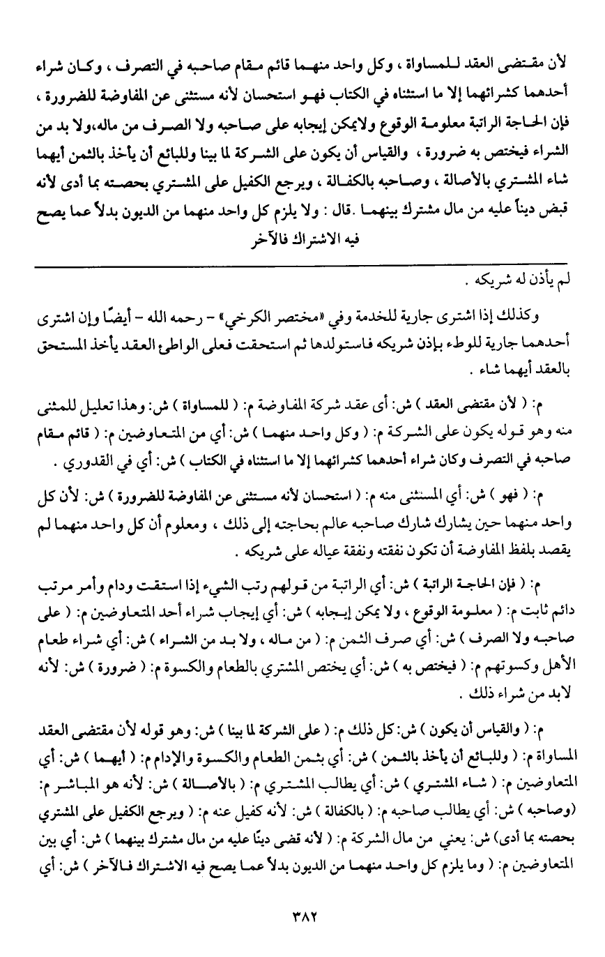 م: (لأن مقتضى العقد) ش: أي عقد شركة المفاوضة م: (للمساواة) ش: وهذا تعليل للمثنى منه، وهو قوله يكون على الشركة م: (وكل واحد منهما) ش: أي من المتعاوضين م: (قائم مقام صاحبه في التصرف وكان شراء أحدهما كشرائهما إلا ما استثناه في الكتاب) ش: أي في القدوري.