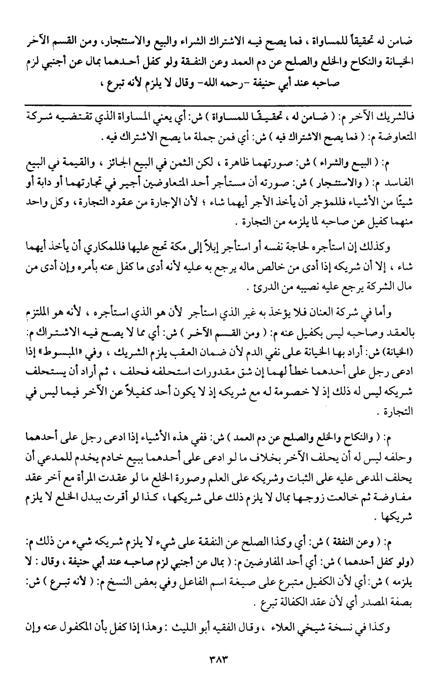ـــــــــــــــــــــــــــــQفالشريك الآخر م: (ضامن له، تحقيقاً للمساواة) ش: أي يعني المساواة الذي تقتضيه شركة المتعاوضة م: (فما يصح الاشتراك فيه) ش: أي فمن جملة ما يصح الاشتراك فيه.