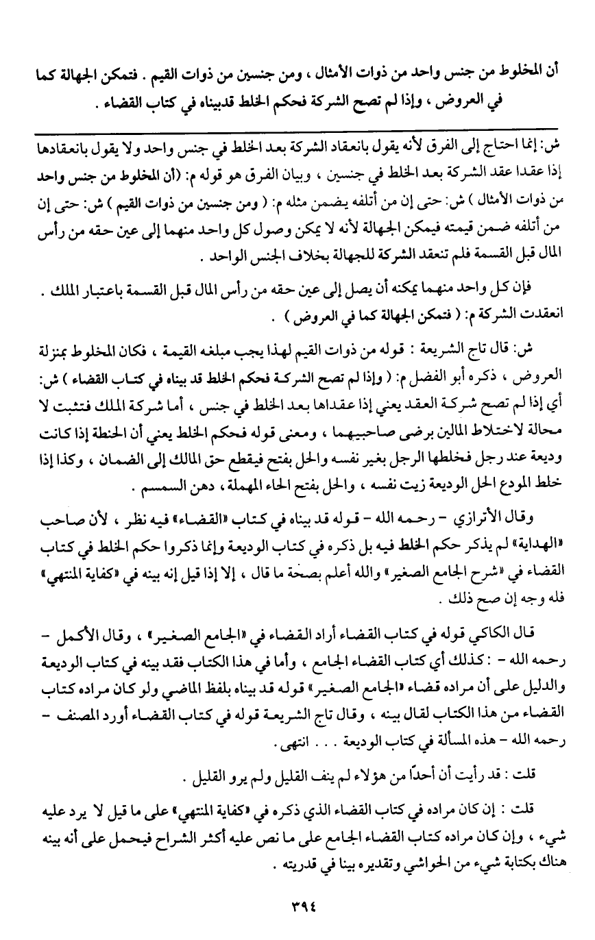 أن المخلوط من جنس واحد من ذوات الأمثال، ومن جنسين من ذوات القيم. فتمكن الجهالة كما في العروض، وإذا لم تصح الشركة فحكم الخلط قد بيناه في كتاب القضاء.