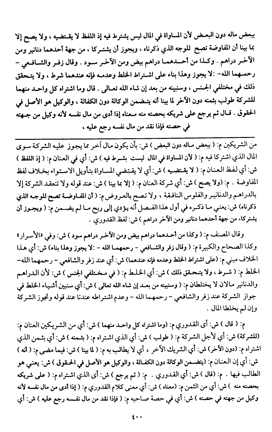 ببعض ماله دون البعض لأن المساواة في المال ليس يشترط فيه إذ اللفظ لا يقتضيه، ولا يصح إلا بما بينا أن المفاوضة تصح للوجه الذي ذكرناه، ويجوز أن يشتركا، من جهة أحدهما دنانير ومن الآخر دراهم. وكذا من أحدهما دراهم بيض ومن الآخر سود. وقال زفر والشافعي - رحمهما الله -: لا يجوز وهذا بناء على اشتراط الخلط وعدمه فإنه عندهما شرط، ولا يتحقق ذلك في مختلفي الجنس، وسنبينه من بعد إن شاء الله تعالى.