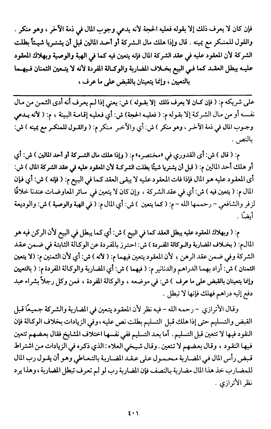 وقال الأترازي - رَحِمَهُ اللَّهُ -: فيه نظر؛ لأن المعقود يتعين في المضاربة والشركة جميعًا قبل القبض والتسليم حتى إذا هلك قبل التسليم بطلت نص عليه، وفي الزيادات بخلاف الوكالة فإن النقود فيها لا تتعين قبل التسليم. أما بعد التسليم ففي نفسها اختلاف المشايخ، فقال بعضهم: تتعين فيها النقود، وقال بعضهم: لا تتعين. وقال شيخي العلاء: الذي ذكره في الزيادات من اشتراط قبض رأس المال في المضاربة محمول على عقد المضاربة بالتعاطي وهو أن يقول رب المال للمضارب خذ هذا المال مضاربة بالنصف فإن المضاربة رب لو لم تعرف تبطل المضاربة، وهذا يرد نظر الأترازي.