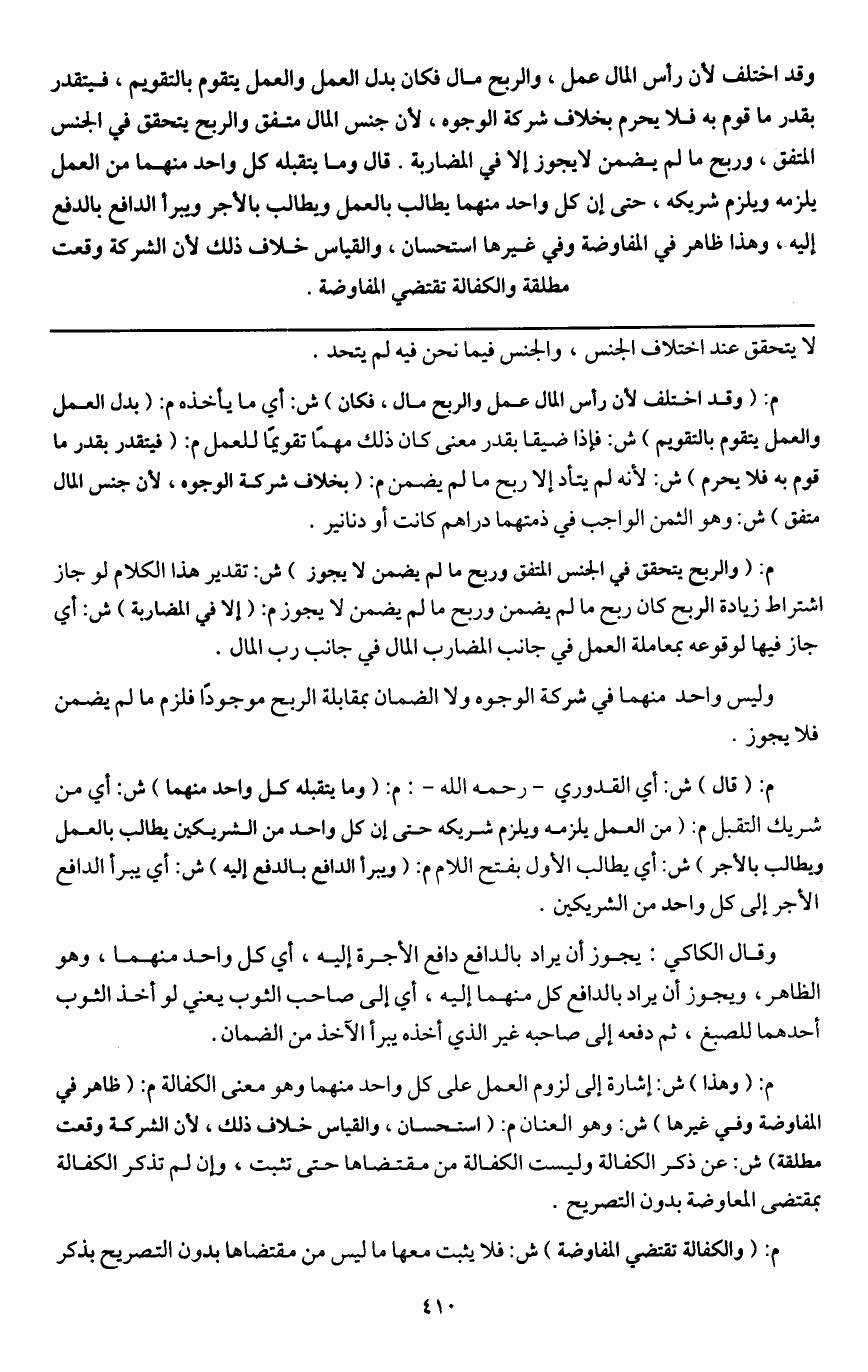 م: (وقد اختلف لأن رأس المال عمل والربح مال، فكان) ش: أي ما يأخذه. م: (بدل العمل والعمل يتقوم بالتقويم) ش: فإذا ضيقا بقدر معنى كان ذلك مهمًا تقويمًا للعمل. م: (فيتقدر بقدر ما قوم به فلا يحرم) ش: لأنه لم يتأد إلا ربح ما لم يضمن. م: (بخلاف شركة الوجوه؛ لأن جنس المال متفق) ش: وهو الثمن الواجب في ذمتهما دراهم كانت أو دنانير.