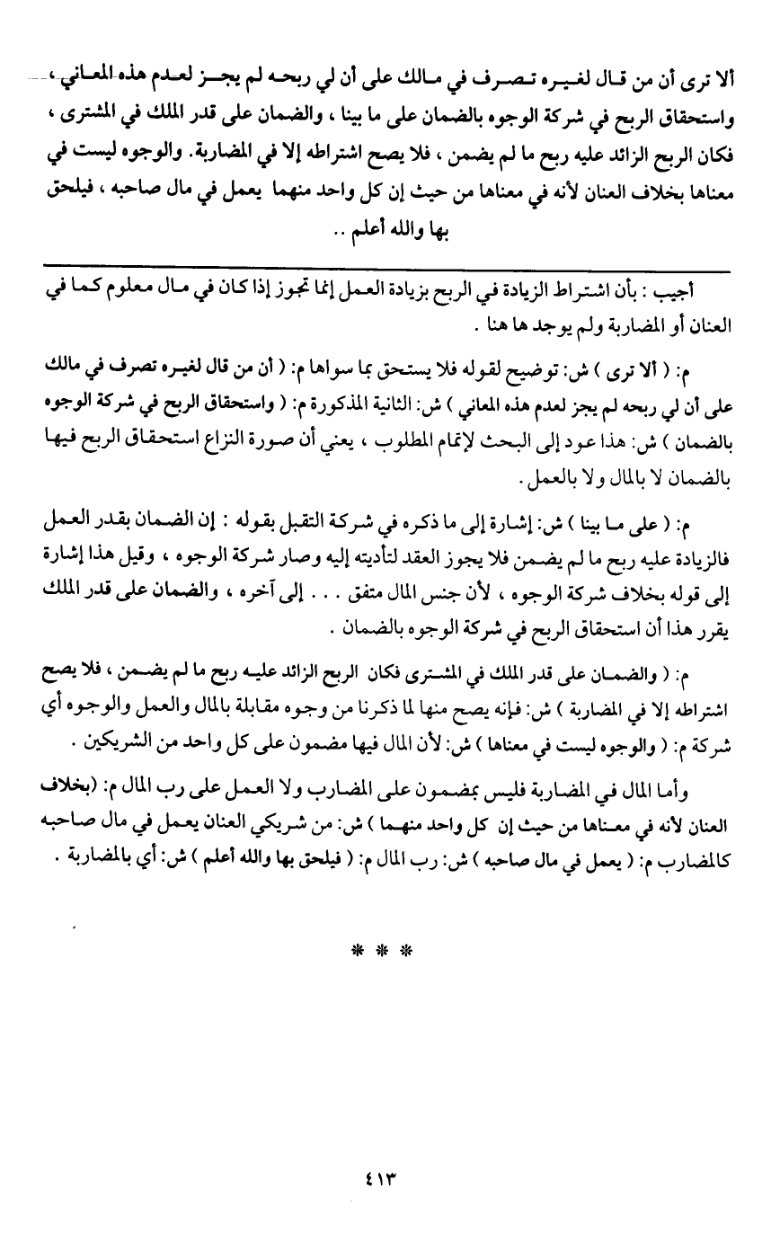 ألا ترى أن ما قال لغيره تصرف في مالك على أن لي ربحه لم يجز لعدم هذه المعاني، واستحقاق الربح في شركة الوجوه بالضمان على ما بينا، والضمان على قدر الملك في المشترى، فكان الربح الزائد عليه ربح ما لم يضمن، فلا يصح اشتراطه إلا في المضاربة. والوجوه ليست في معناها بخلاف العنان لأنه في معناها من حيث إن كل واحد منهما يعمل في مال صاحبه، فيلحق بها، والله أعلم.