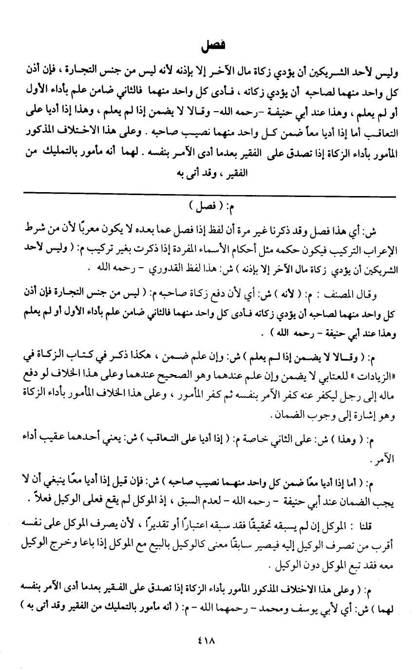 ـــــــــــــــــــــــــــــQم: (فصل) ش: أي هذا فصل وقد ذكرنا غير مرة أن لفظ إذا فصل عما بعده لا يكون معربًا؛ لأن من شرط الإعراب التركيب فيكون حكمه مثل أحكام الأسماء المفردة إذا ذكرت بغير تركيب. م: (وليس لأحد الشريكين أن يؤدي زكاة مال الآخر إلا بإذنه) ش: هذا لفظ القدوري - رَحِمَهُ اللَّهُ -.