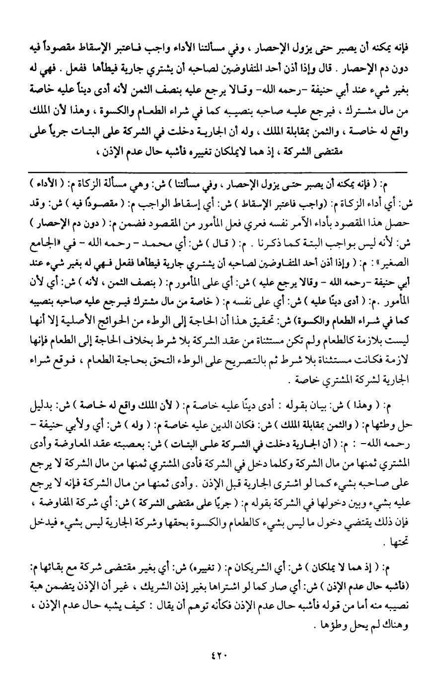 ـــــــــــــــــــــــــــــQم: (فإنه يمكنه أن يصبر حتى يزول الإحصار، وفي مسألتنا) ش: وهي مسألة الزكاة. م: (الأداء) ش: أي أداء الزكاة. م: (واجب فاعتبر الإسقاط) ش: أي إسقاط الواجب. م: (مقصودًا فيه) ش: وقد حصل هذا المقصود بأداء الآمر نفسه فعري فعل المأمور من المقصود فضمن. م: (دون دم الإحصار) ش: لأنه ليس بواجب البتة كما ذكرنا. م: (قال) ش: أي محمد - رَحِمَهُ اللَّهُ - في " الجامع الصغير ": م: (وإذا أذن أحد المتفاوضين لصاحبه أن يشتري جارية فيطأها ففعل. فهي له بغير شيء عند أبي حنيفة - رَحِمَهُ اللَّهُ - وقالا يرجع عليه) ش: أي على المأمور. م: (بنصف الثمن؛ لأنه) ش: أي لأن المأمور. م: (أدى دينًا عليه) ش: أي على نفسه. م: (خاصة من مال مشترك، فيرجع عليه صاحبه بنصيبه كما في شراء الطعام والكسوة) ش: تحقيق هذا أن الحاجة إلى الوطء من الحوائج الأصلية إلا أنها ليست بلازمة كالطعام ولم تكن مستثناة من عقد الشركة بلا شرط بخلاف الحاجة إلى الطعام فإنها لازمة فكانت مستثناة بلا شرط ثم بالتصريح على الوطء التحق بحاجة الطعام، فوقع شراء الجارية لشركة المشتري خاصة.