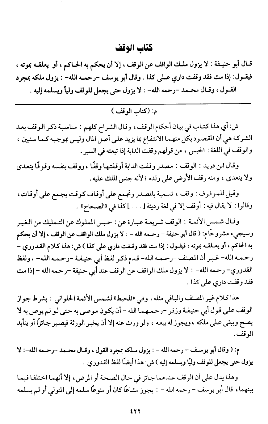 وقال شمس الأئمة: الوقف شريعة عبارة عن: حبس المملوك عن التمليك من الغير وسيجيء مشروحًا. م: (قال أبو حنيفة - رَحِمَهُ اللَّهُ -: لا يزول ملك الواقف عن الوقف، إلا أن يحكم به الحاكم، أو يعلقه بموته، فيقول: إذا مت فقد وقفت داري على كذا) ش: هذا كلام القدوري - رَحِمَهُ اللَّهُ - غير أن المصنف - رَحِمَهُ اللَّهُ - قدم ذكر لفظ أبي حنيفة - رَحِمَهُ اللَّهُ -، ولفظ القدوري - رَحِمَهُ اللَّهُ -: لا يزول ملك الواقف عن الوقف عند أبي حنيفة - رَحِمَهُ اللَّهُ - إذا مت فقد وقفت داري على كذا.