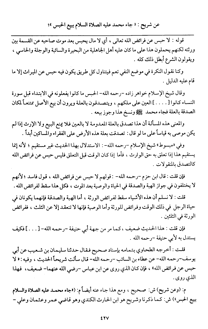وفي " مبسوط " شيخ الإسلام - رَحِمَهُ اللَّهُ -: الاستدلال بهذا الحديث غير مستقيم؛ لأنه إنما يستقيم هذا إذا تعلق به حق الوارث، فأما إذا كان الوقف قبل التعلق فليس حبس عن فرائض الله كالتصدق بالمنقولات.