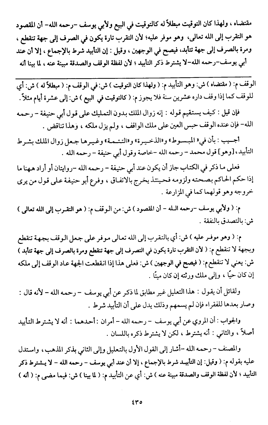 مقتضاه، ولهذا كان التوقيت مبطلا له كالتوقيت في البيع ولأبي يوسف - رَحِمَهُ اللَّهُ - أن المقصود هو التقرب إلى الله تعالى، وهو موفر عليه؛ لأن التقرب تارة يكون في الصرف إلى جهة تنقطع، ومرة بالصرف إلى جهة تتأبد، فيصح في الوجهين، وقيل: إن التأبيد شرط بالإجماع، إلا أن عند أبي يوسف - رَحِمَهُ اللَّهُ - لا يشترط ذكر التأبيد؛ لأن لفظة الوقف والصدقة مبينة عنه، لما بينا أنه