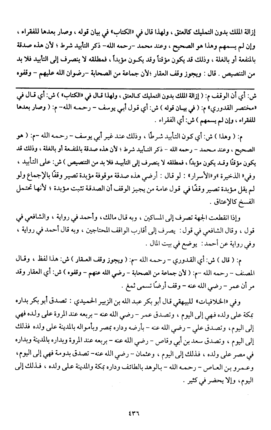 وفي " الخلافيات " للبيهقي قال أبو بكر عبد الله بن الزبير الحميدي: تصدق أبو بكر بداره بمكة على ولده فهي إلى اليوم، وتصدق عمر - رَضِيَ اللَّهُ عَنْهُ - بربعه عند المروة على ولده فهي إلى اليوم، وتصدق علي - رَضِيَ اللَّهُ عَنْهُ - بأرضه وداره بمصر وبأمواله بالمدينة على ولده فذلك إلى اليوم، وتصدق سعد بن أبي وقاص - رَضِيَ اللَّهُ عَنْهُ - بربعه عند المروة وبداره بالمدينة وبداره في مصر على ولده، فذلك إلى اليوم، وعثمان - رَضِيَ اللَّهُ عَنْهُ - تصدق بدومة فهي إلى اليوم، وعمرو بن العاص - رَحِمَهُ اللَّهُ - بالوهد بالطائف وداره بمكة والمدينة على ولده، فذلك إلى اليوم، وإلا يحضر في كثير.