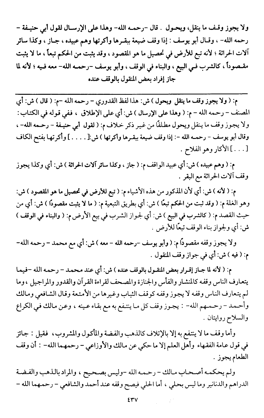 ولا يجوز وقف ما ينقل، ويحول. قال - رَحِمَهُ اللَّهُ -: وهذا على الإرسال لقول أبي حنيفة - رَحِمَهُ اللَّهُ -، وقال أبو يوسف: إذا وقف ضيعة ببقرها وأكرتها وهم عبيده، جاز، وكذا سائر آلات الحراثة؛ لأنه تبع للأرض في تحصيل ما هو المقصود، وقد يثبت من الحكم تبعا، ما لا يثبت مقصودا، كالشرب في البيع، والبناء في الوقف، وأبو يوسف - رَحِمَهُ اللَّهُ - معه فيه؛ لأنه لما جاز إفراد بعض المنقول بالوقف عنده.
