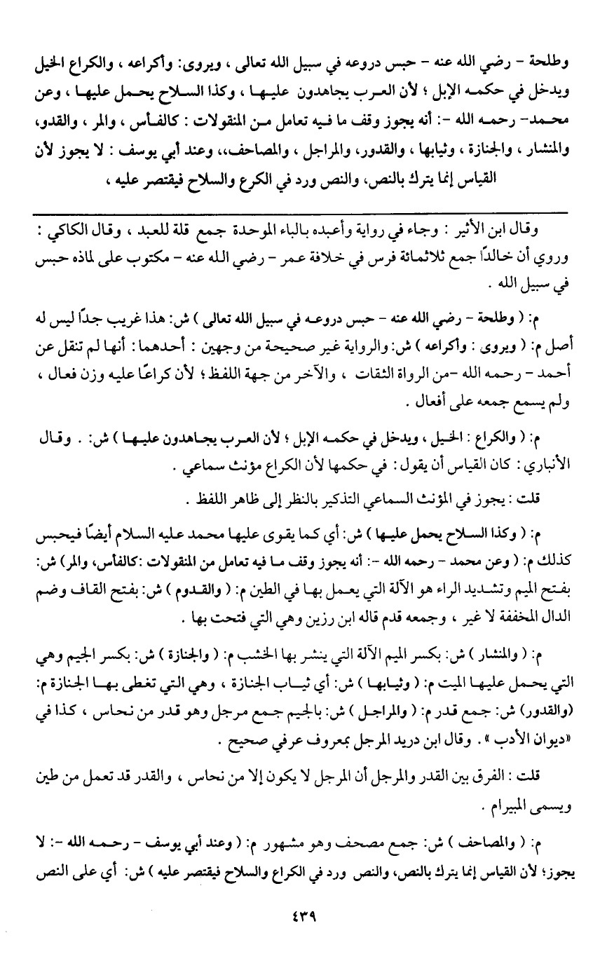 وطلحة - رَضِيَ اللَّهُ عَنْهُ - حبس دروعه في سبيل الله تعالى، ويروى: وأكراعه، والكراع الخيل ويدخل في حكمه الإبل؛ لأن العرب يجاهدون عليها، وكذا السلاح يحمل عليها، وعن محمد - رَحِمَهُ اللَّهُ -: أنه يجوز وقف ما فيه تعامل من المنقولات: كالفأس، والمر، والقدو، والمنشار، والجنازة، وثيابها، والقدور، والمراجل، والمصاحف، وعند أبي يوسف: لا يجوز لأن القياس إنما يترك بالنص، والنص ورد في الكرع والسلاح فيقتصر عليه،