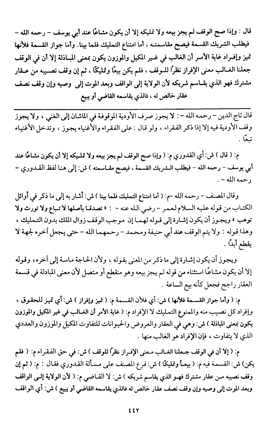 م: (قال) ش: أي القدوري. م: (وإذا صح الوقف لم يجز بيعه ولا تمليكه إلا أن يكون مشاعًا عند أبي يوسف - رَحِمَهُ اللَّهُ - فيطلب الشريك القسمة، فيصح مقاسمته) ش: إلى هنا لفظ القدوري - رَحِمَهُ اللَّهُ -.