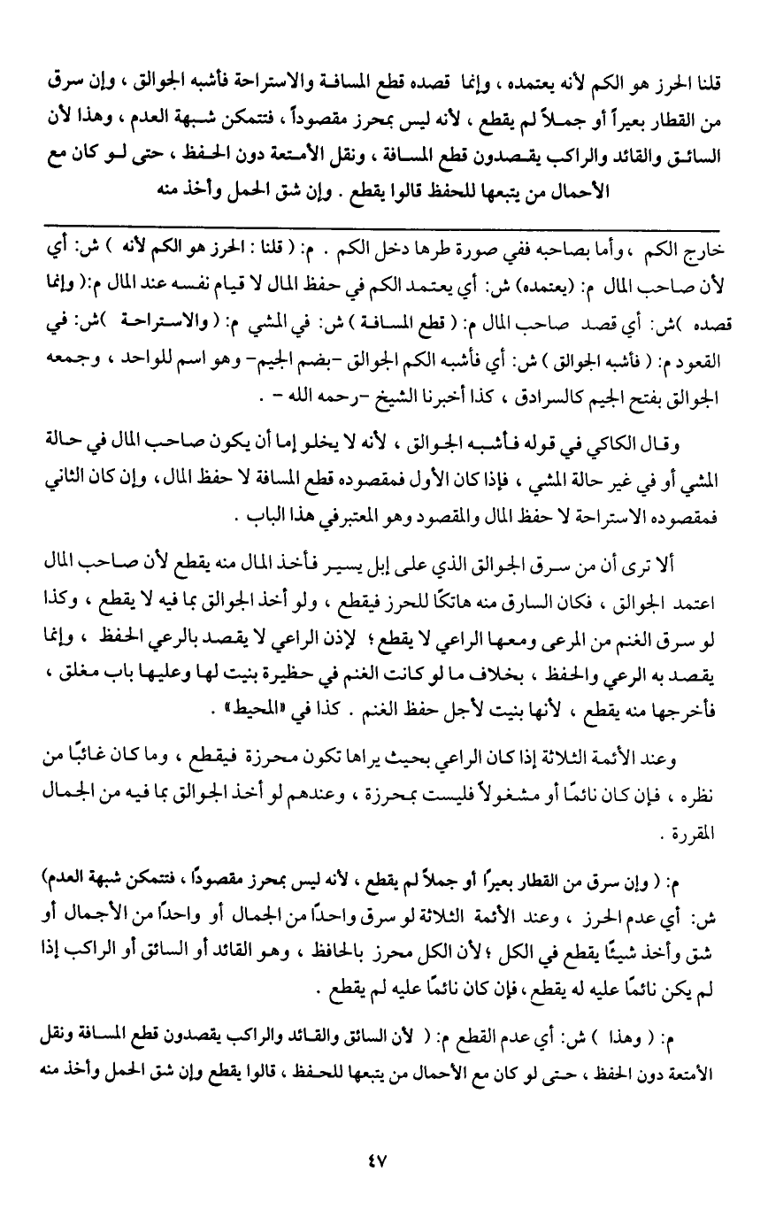 وعند الأئمة الثلاثة إذا كان الراعي بحيث يراها تكون محرزة فيقطع، وما كان غائباً من نظره، فإن كان نائماًَ أو مشغولاً فليست بمحرزة، وعندهم لو أخذ الجوالق بما فيه من الجمال المقررة.
