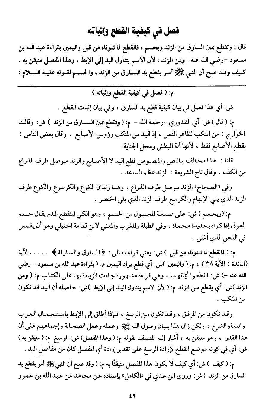 فصل في كيفية القطع وإثباته قال: وتقطع يمين السارق من الزند ويحسم، فالقطع لما تلوناه من قبل واليمين بقراءة عبد الله بن مسعود - رَضِيَ اللَّهُ عَنْهُ - ومن الزند؛ لأن الاسم يتناول اليد إلى الإبط، وهذا المفصل متيقن به. كيف وقد صح أن النبي - صَلَّى اللَّهُ عَلَيْهِ وَسَلَّمَ - أمر بقطع يد السارق من الزند، والحسم؛ لقوله - عَلَيْهِ السَّلَامُ -: