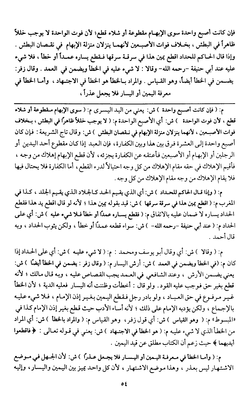 ـــــــــــــــــــــــــــــQم: (فإن كانت أصبع واحدة) ش: يعني من اليد اليسرى م: (سوى الإبهام مقطوعة أو شلاء قطع؛ لأن فوت الواحدة) ش: أي الأصبع الواحدة م: (لا يوجب خللاً ظاهراً في البطش، بخلاف فوات الأصبعين، لأنهما ينزلان منزلة الإبهام في نقصان البطش) ش: وقال تاج الشريعة: فإن كان أصبع واحدة إلى العشرة فرق بين هذا وبين الكفارة، فإن العبد إذا كان مقطوع أحد اليدين أو الرجلين أو الإبهام أو الأصبعين فأعتقه عن الكفارة يجزئه؛ لأن قطع الإبهام إهلاك من وجه، فأقيم الإهلاك في حقه مقام الإهلاك من كل وجه احتيالاً لدرء القطع، أما الكفارة فلا يحتال فيها فلا يقام الإهلاك من وجه مقام الإهلاك من كل وجه