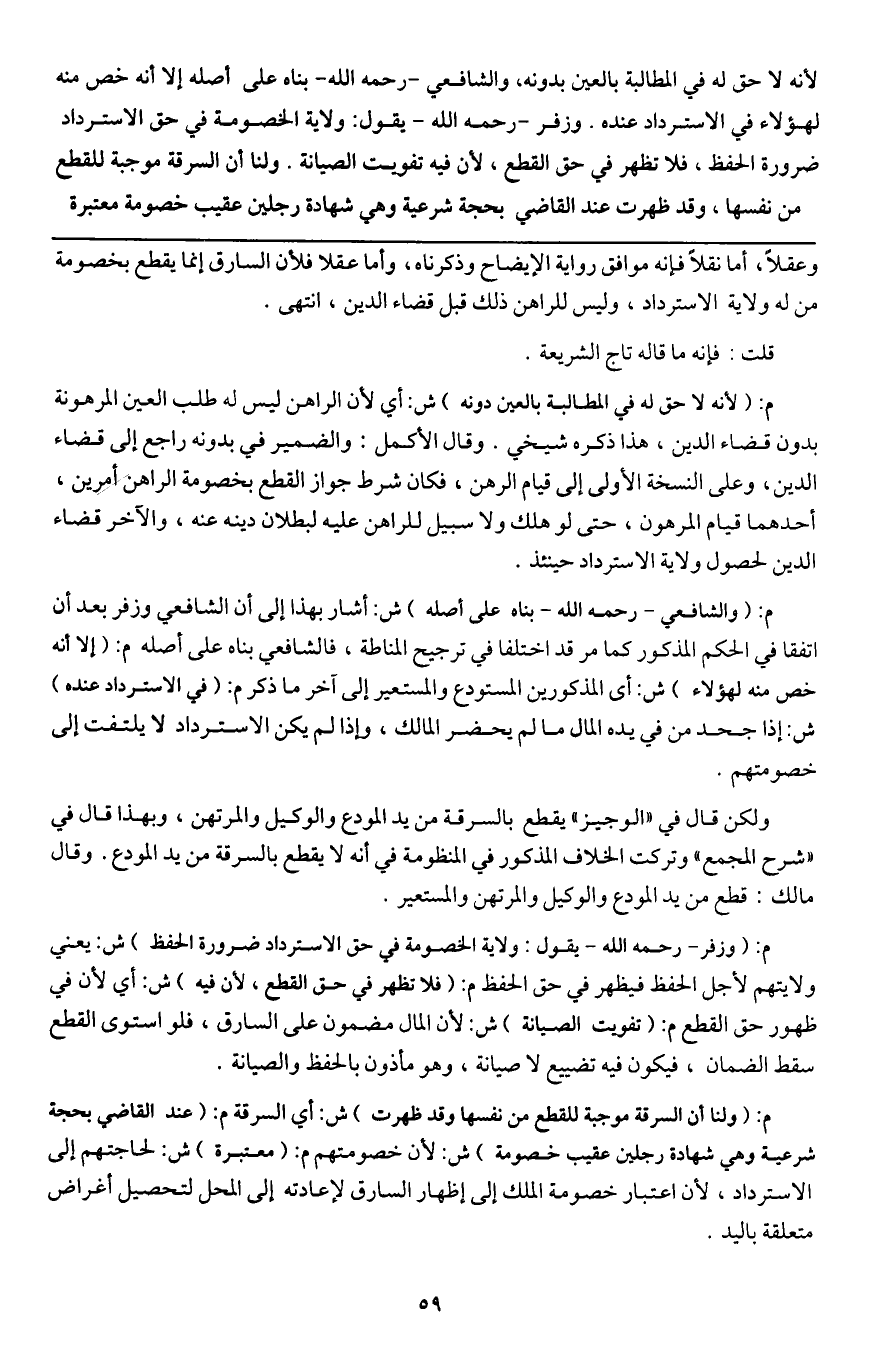ـــــــــــــــــــــــــــــQوعقلاً، أما نقلاً فإنه موافق رواية الإيضاح وذكرناه، وأما عقلاً فلأن السارق إنما يقطع بخصومة من له ولاية الاسترداد، وليس للراهن ذلك قبل قضاء الدين، انتهى.
