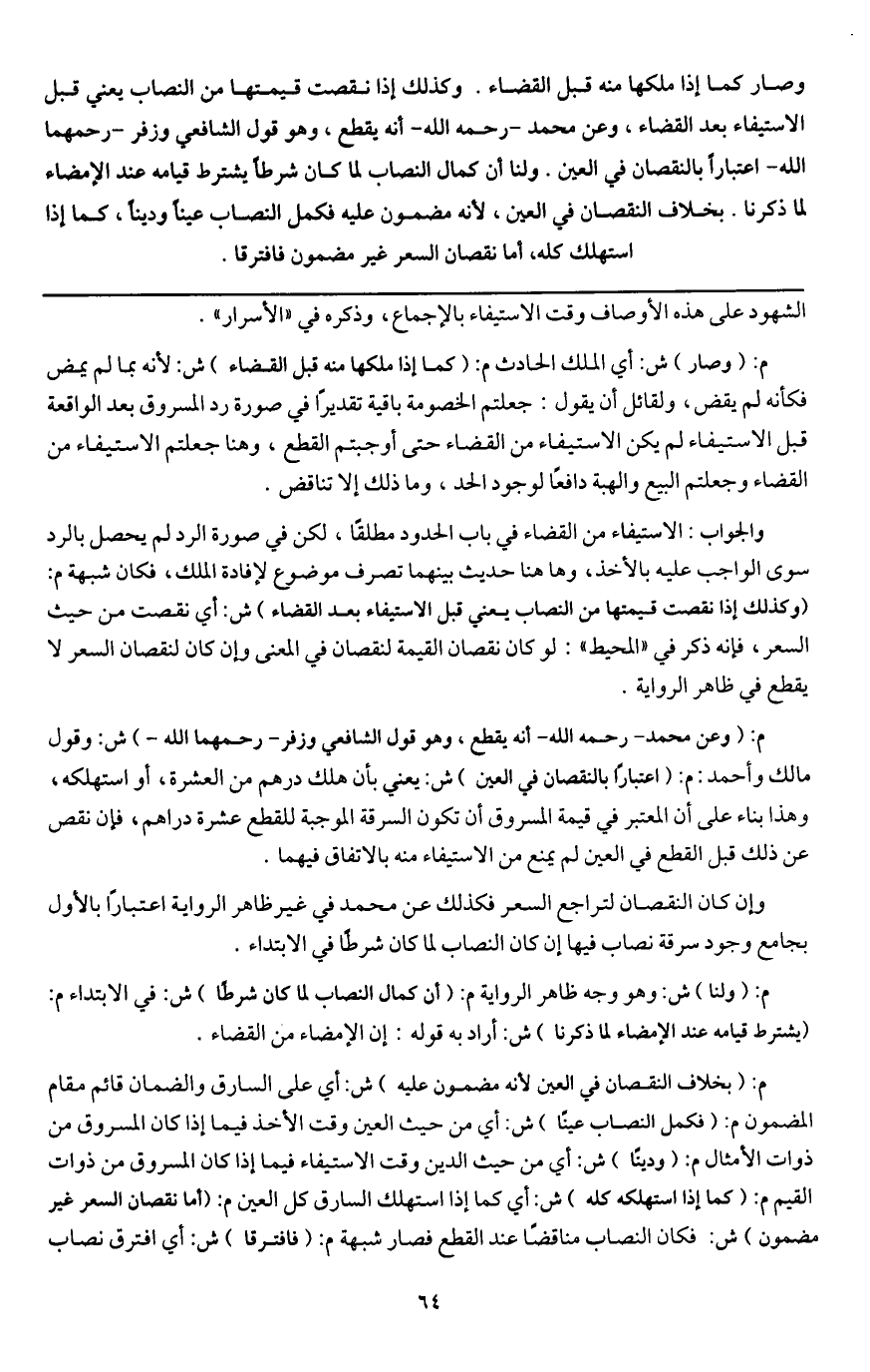 وصار كما إذا ملكها منه قبل القضاء. وكذلك إذا نقصت قيمتها من النصاب يعني قبل الاستيفاء بعد القضاء، وعن محمد - رَحِمَهُ اللَّهُ - أنه يقطع، وهو قول الشافعي وزفر - رحمهما الله - اعتبارا بالنقصان في العين. ولنا أن كمال النصاب لما كان شرطا يشترط قيامه عند الإمضاء لما ذكرنا. بخلاف النقصان في العين؛ لأنه مضمون عليه فكمل النصاب عينا ودينا، كما إذا استهلك كله، أما نقصان السعر غير مضمون فافترقا.
