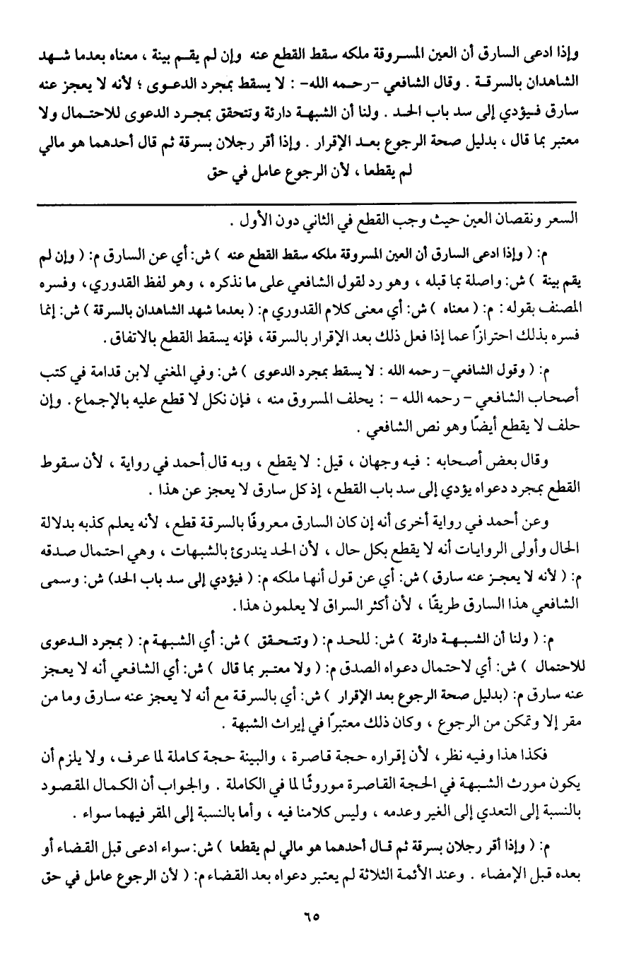 م: (وقول الشافعي - رَحِمَهُ اللَّهُ -: لا يسقط بمجرد الدعوى) ش: وفي المغني لابن قدامة في كتب أصحاب الشافعي - رَحِمَهُ اللَّهُ -: يحلف المسروق منه، فإن نكل لا قطع عليه بالإجماع. وإن حلف لا يقطع أيضاً وهو نص الشافعي.