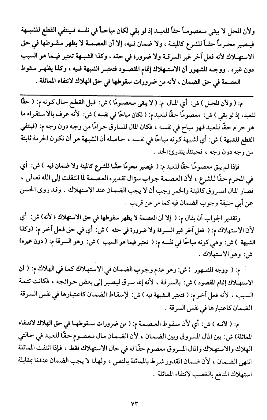 ولأن المحل لا يبقى معصوما حقا للعبد إذ لو بقي لكان مباحا في نفسه فينتفي القطع للشبهة فيصير محرما حقا للشرع كالميتة، ولا ضمان فيه، إلا أن العصمة لا يظهر سقوطها في حق الاستهلاك؛ لأنه فعل آخر غير السرقة ولا ضرورة في حقه، وكذا الشبهة تعتبر فيما هو السبب دون غيره. ووجه المشهور أن الاستهلاك إتمام المقصود فتعتبر الشبهة فيه، وكذا يظهر سقوط العصمة في حق الضمان، لأنه من ضرورات سقوطها في حق الهلاك لانتفاء المماثلة