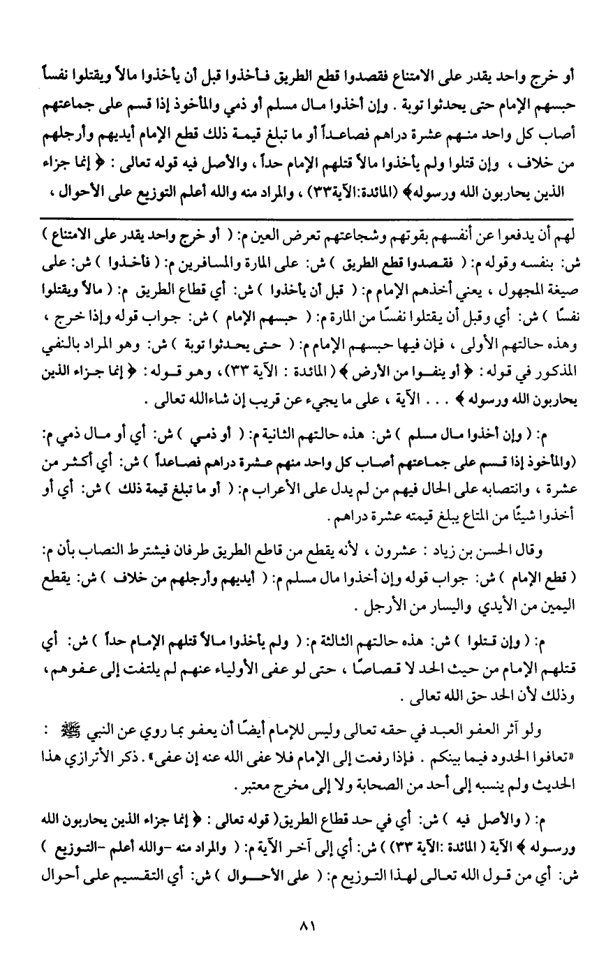 أو خرج واحد يقدر على الامتناع فقصدوا قطع الطريق فأخذوا قبل أن يأخذوا مالا ويقتلوا نفسا حبسهم الإمام حتى يحدثوا توبة. وإن أخذوا مال مسلم أو ذمي والمأخوذ إذا قسم على جماعتهم أصاب كل واحد منهم عشرة دراهم فصاعدا أو ما تبلغ قيمة ذلك قطع الإمام أيديهم وأرجلهم من خلاف، وإن قتلوا ولم يأخذوا مالا قتلهم الإمام حدا،