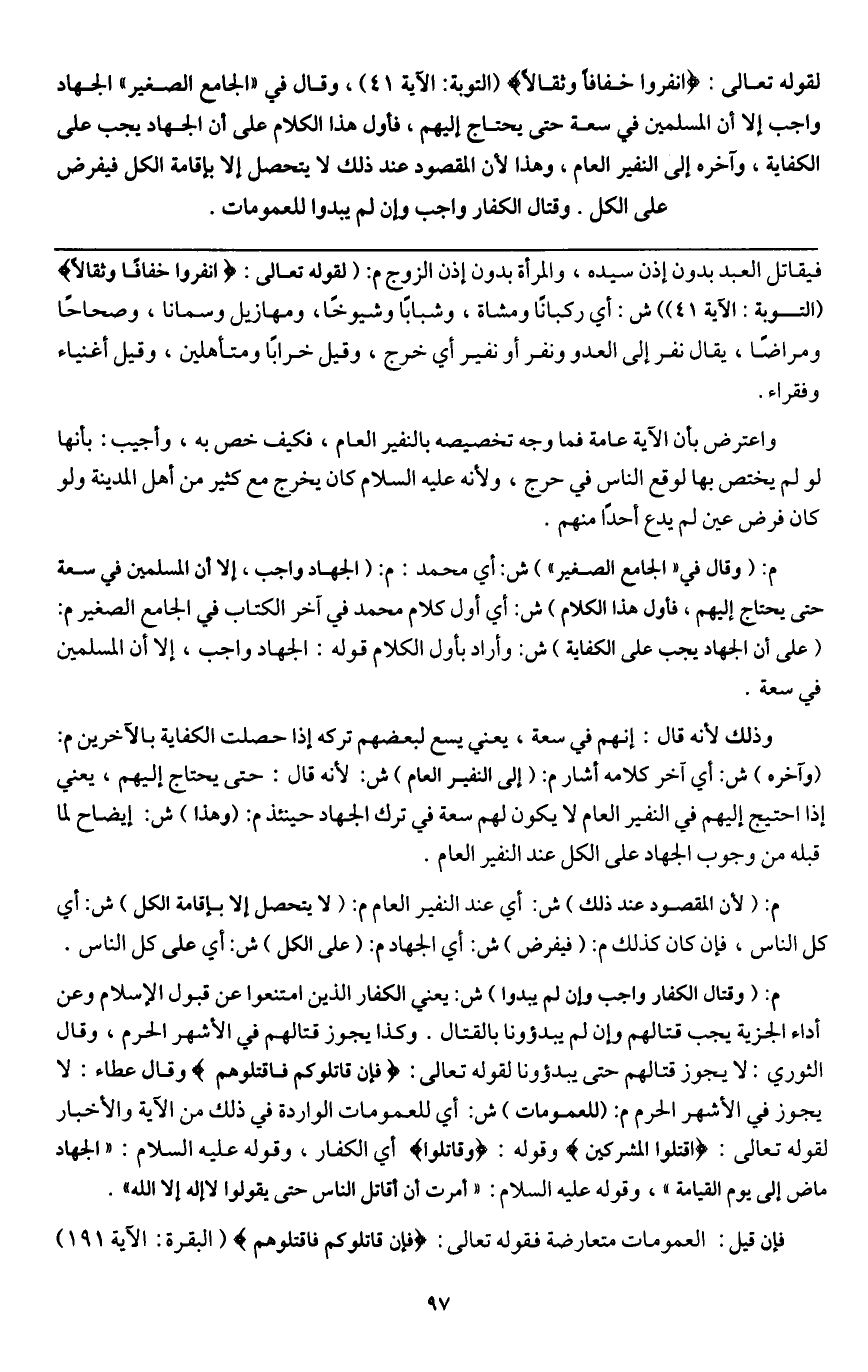 ـــــــــــــــــــــــــــــQفيقاتل العبد بدون إذن سيده، والمرأة بدون إذن الزوج م: (لِقَوْلِهِ تَعَالَى: {انْفِرُوا خِفَافًا وَثِقَالًا} [التوبة: 41] (التوبة: الآية 41) ش: أي ركباناً ومشاة، وشباباً وشيوخاً، ومهازيل وسماناً، وصحاحاً ومراضاً، يقال: نفر إلى العدو ونفر أو نفير أي خرج، وقيل خراباً ومتأهلين، وقيل أغنياء وفقراء.