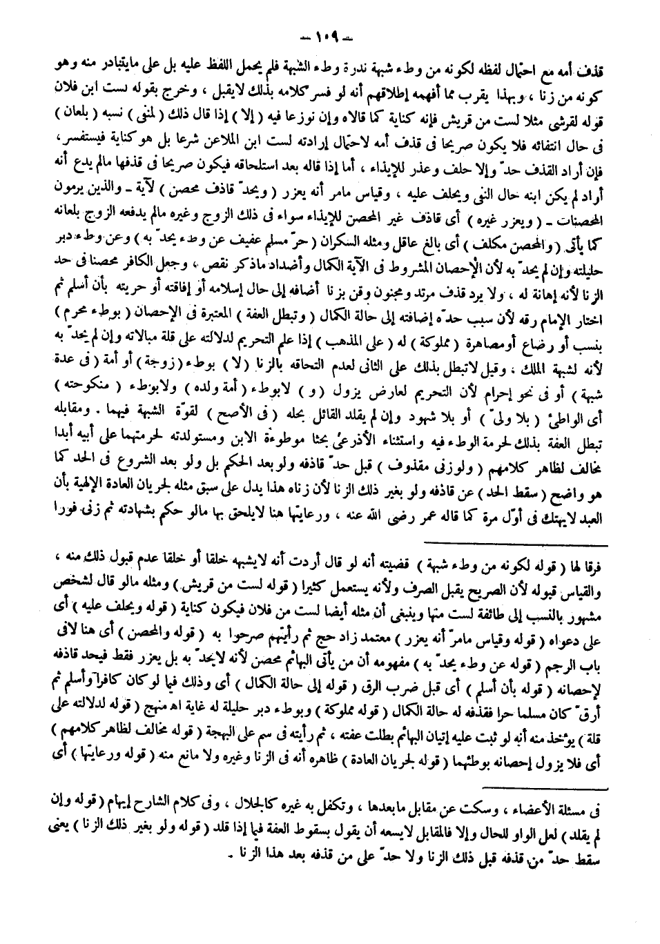 قَذْفِ أُمِّهِ مَعَ احْتِمَالِ لَفْظِهِ لِكَوْنِهِ مِنْ وَطْءِ شُبْهَةِ نُدْرَةُ وَطْءِ الشُّبْهَة فَلَمْ يُحْمَلْ اللَّفْظُ عَلَيْهِ بَلْ عَلَى مَا يَتَبَادَرُ مِنْهُ وَهُوَ كَوْنُهُ مِنْ زِنًا، وَبِهَذَا يَقْرُبُ مِمَّا أَفْهَمُهُ إطْلَاقُهُمْ أَنَّهُ لَوْ فَسَّرَ كَلَامَهُ بِذَلِكَ لَا يُقْبَلُ، وَخَرَجَ بِقَوْلِهِ لَسْت ابْنَ فُلَانٍ قَوْلُهُ لِقُرَشِيٍّ مَثَلًا لَسْت مِنْ قُرَيْشٍ فَإِنَّهُ كِنَايَةٌ كَمَا قَالَاهُ وَإِنْ نُوزِعَا فِيهِ (إلَّا) إذَا قَالَ ذَلِكَ (لِمَنْفِيٍّ) نَسَبُهُ (بِلِعَانٍ) فِي حَالِ انْتِفَائِهِ فَلَا يَكُونُ صَرِيحًا فِي قَذْفِ أُمِّهِ لِاحْتِمَالِ إرَادَتِهِ لَسْت ابْنَ الْمُلَاعِنِ شَرْعًا بَلْ هُوَ كِنَايَةٌ فَيُسْتَفْسَرُ، فَإِنْ أَرَادَ الْقَذْفَ حُدَّ وَإِلَّا حَلَفَ وَعُزِّرَ لِلْإِيذَاءِ، أَمَّا إذَا قَالَهُ بَعْدَ اسْتِلْحَاقِهِ فَيَكُونُ صَرِيحًا فِي قَذْفِهَا مَا لَمْ يَدَّعِ أَنَّهُ أَرَادَ لَمْ يَكُنْ ابْنَهُ حَالَ النَّفْيِ وَيَحْلِفُ عَلَيْهِ، وَقِيَاسُ مَا مَرَّ أَنَّهُ يُعَزَّرُ.
