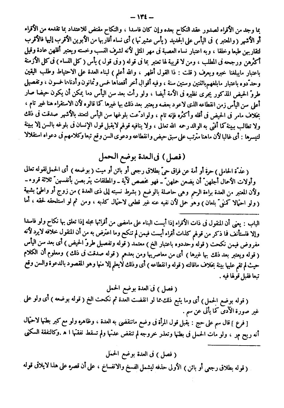 (فَصْلٌ) فِي الْعِدَّةِ بِوَضْعِ الْحَمْلِ (قَوْلُهُ بِوَضْعِ الْحَمْلِ) أَيْ وَمَا يَتْبَعُ ذَلِكَ مِمَّا لَوْ انْقَضَتْ الْعِدَّةُ ثُمَّ نُكِحَتْ إلَخْ (قَوْلُهُ: بِوَضْعِهِ) أَيْ وَلَوْ عَلَى غَيْرِ صُورَةِ الْآدَمِيِّ كَمَا يَأْتِي عَنْ سم. [فَرْعٌ] قَالَ سم عَلَى حَجّ: يُقْبَلُ قَوْلُ الْمَرْأَةِ فِي وَضْعِ مَا تَنْقَضِي بِهِ الْعِدَّةُ، وَظَاهِرُهُ وَلَوْ مَعَ كِبَرِ بَطْنِهَا لِاحْتِمَالِ أَنَّهُ رِيحٌ م ر، وَلَوْ مَاتَ الْحَمْلُ فِي بَطْنِهَا وَتَعَذَّرَ خُرُوجُهُ لَمْ تَنْقَضِ عِدَّتُهَا وَلَمْ تَسْقُطْ نَفَقَتُهَا اهـ.