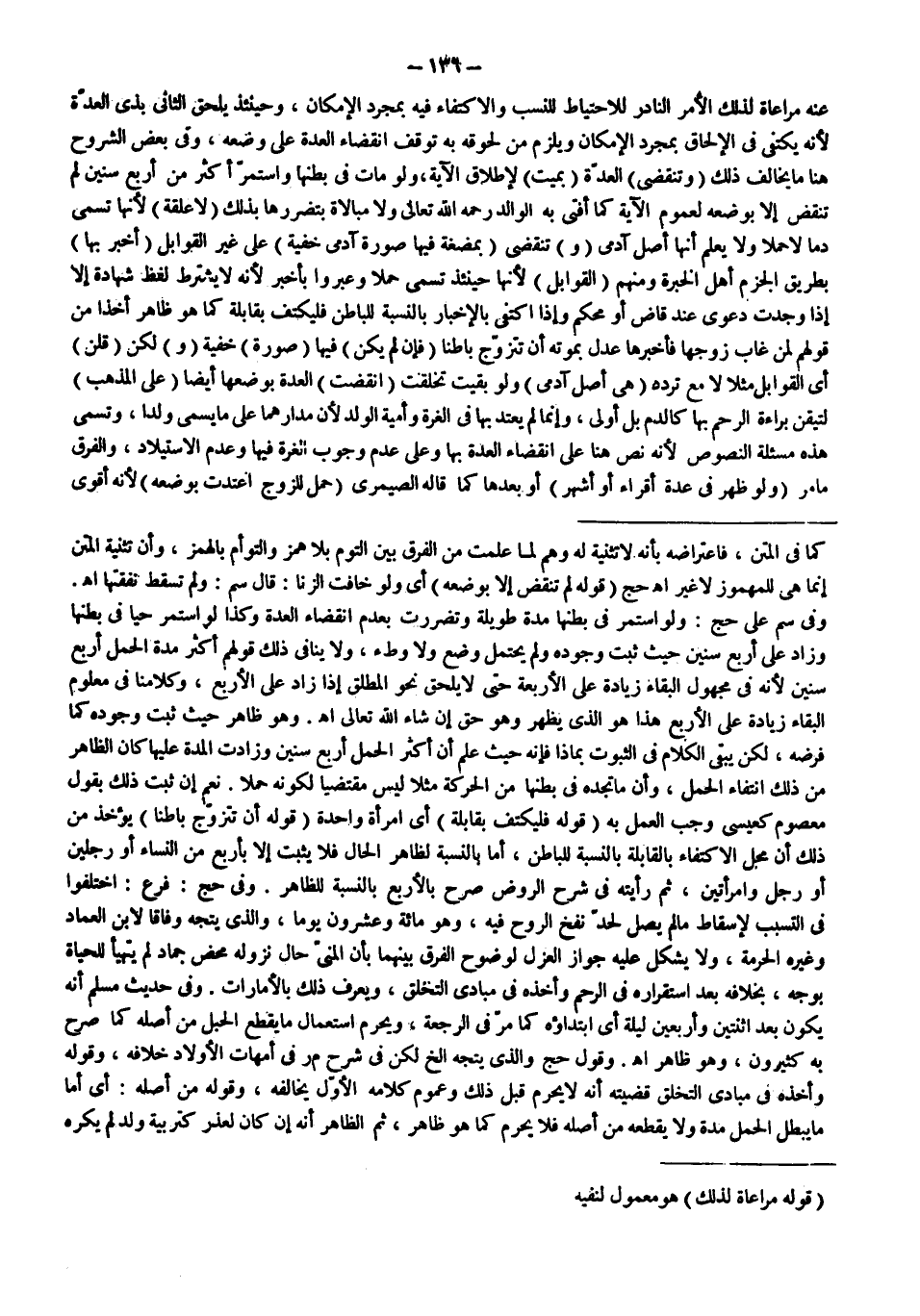 عَنْهُ مُرَاعَاةً لِذَلِكَ الْأَمْرِ النَّادِرِ لِلِاحْتِيَاطِ لِلنَّسَبِ وَالِاكْتِفَاءِ فِيهِ بِمُجَرَّدِ الْإِمْكَانِ، وَحِينَئِذٍ يَلْحَقُ الثَّانِي بِذِي الْعِدَّةِ لِأَنَّهُ يَكْتَفِي فِي الْإِلْحَاقِ بِمُجَرَّدِ الْإِمْكَانِ وَيَلْزَمُ مِنْ لُحُوقُهُ بِهِ تَوَقُّفُ انْقِضَاءِ الْعِدَّةِ عَلَى وَضْعِهِ، وَفِي بَعْضِ الشُّرُوحِ هُنَا مَا يُخَالِفُ ذَلِكَ (وَتَنْقَضِي) الْعِدَّةُ (بِمَيِّتٍ) لِإِطْلَاقِ الْآيَةِ، وَلَوْ مَاتَ فِي بَطْنِهَا وَاسْتَمَرَّ أَكْثَرَ مِنْ أَرْبَعِ سِنِينَ لَمْ تَنْقَضِ إلَّا بِوَضْعِهِ لِعُمُومِ الْآيَةِ كَمَا أَفْتَى بِهِ الْوَالِدُ - رَحِمَهُ اللَّهُ تَعَالَى - وَلَا مُبَالَاةَ بِتَضَرُّرِهَا بِذَلِكَ (لَا عَلَقَةَ) لِأَنَّهَا تُسَمَّى دَمًا لَا حَمْلًا وَلَا يُعْلَمُ أَنَّهَا أَصْلٌ آدَمِيٌّ (وَ) تَنْقَضِي (بِمُضْغَةٍ فِيهَا صُورَةُ آدَمِيٍّ خِفْيَةً) عَلَى غَيْرِ الْقَوَابِلِ (أَخْبَرَ بِهَا) بِطَرِيقِ الْجَزْمِ أَهْلُ الْخِبْرَةِ وَمِنْهُمْ (الْقَوَابِلُ) لِأَنَّهَا حِينَئِذٍ تُسَمَّى حَمْلًا وَعَبِّرُوا بِأَخْبَرَ لِأَنَّهُ لَا يُشْتَرَطُ لَفْظُ شَهَادَةٍ إلَّا إذَا وُجِدَتْ دَعْوَى عِنْدَ قَاضٍ أَوْ مُحَكَّمٍ وَإِذَا اكْتَفَى بِالْإِخْبَارِ بِالنِّسْبَةِ لِلْبَاطِنِ فَلْيَكْتَفِ بِقَابِلَةٍ كَمَا هُوَ ظَاهِرٌ أَخْذًا مِنْ قَوْلِهِمْ لِمَنْ غَابَ زَوْجُهَا فَأَخْبَرَهَا عَدْلٌ بِمَوْتِهِ أَنْ تَتَزَوَّجَ بَاطِنًا (فَإِنْ لَمْ يَكُنْ) فِيهَا (صُورَةٌ) خِفْيَةً (وَ) لَكِنْ (قُلْنَ) أَيْ الْقَوَابِلُ مَثَلًا لَا مَعَ تَرَدُّدٍ (هِيَ أَصْلٌ آدَمِيٌّ) وَلَوْ بَقِيَتْ تَخَلَّقَتْ (انْقَضَتْ) الْعِدَّةُ بِوَضْعِهَا أَيْضًا (عَلَى الْمَذْهَبِ) لِتَيَقُّنِ بَرَاءَةِ الرَّحِمِ بِهَا كَالدَّمِ بَلْ أَوْلَى، وَإِنَّمَا لَمْ يَعْتَدَّ بِهَا فِي الْغُرَّةِ وَأُمِّيَّةِ الْوَلَدِ لِأَنَّ مَدَارَهُمَا عَلَى مَا يُسَمَّى وَلَدًا، وَتُسَمَّى هَذِهِ مَسْأَلَةَ النُّصُوصِ لِأَنَّهُ نَصَّ هُنَا عَلَى انْقِضَاءِ الْعِدَّةِ بِهَا وَعَلَى عَدَمِ وُجُوبِ الْغُرَّةِ فِيهَا وَعَدَمِ الِاسْتِيلَادِ، وَالْفَرْقُ مَا مَرَّ
