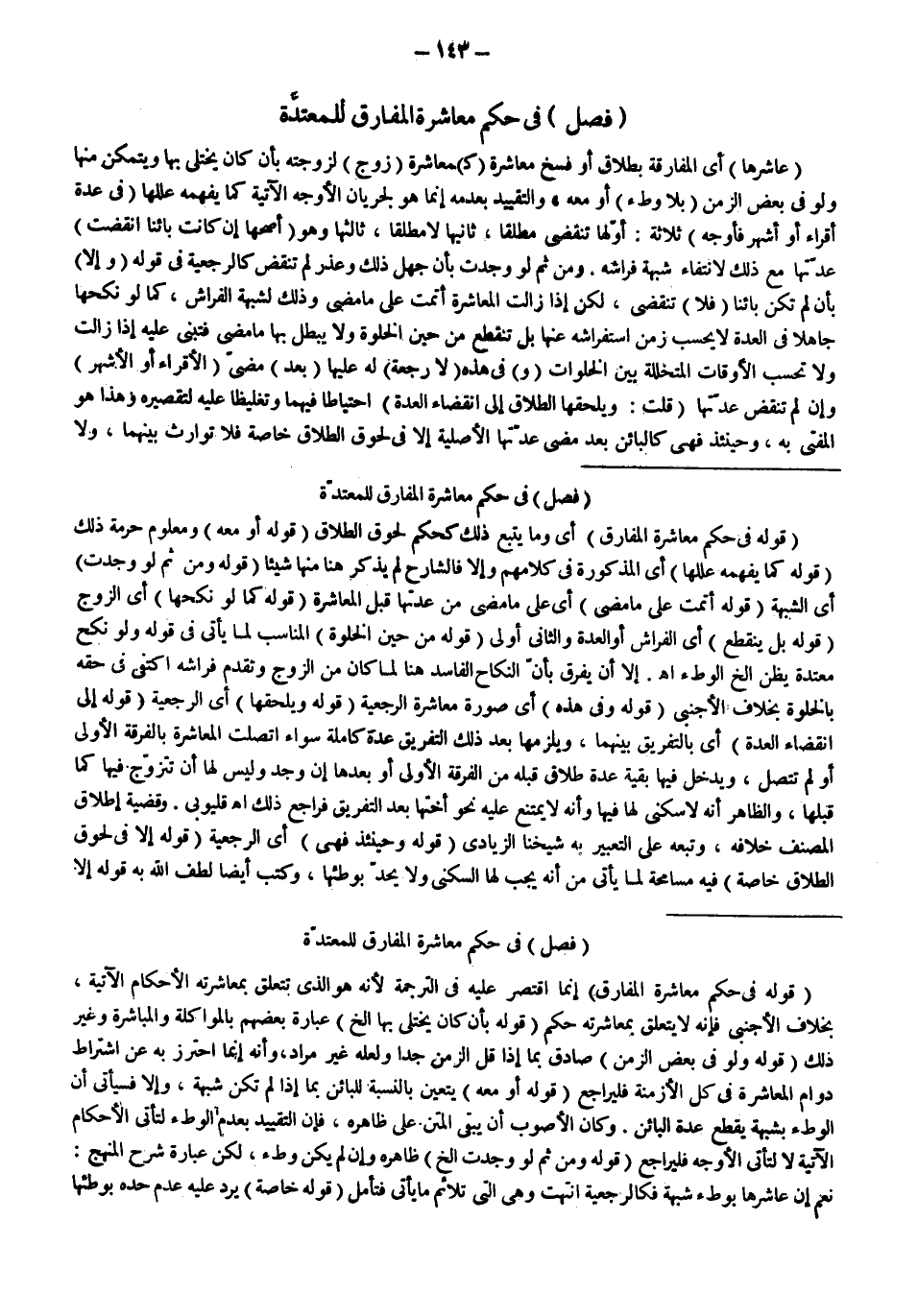ـــــــــــــــــــــــــــــS (فَصْلٌ) فِي حُكْمِ مُعَاشَرَةِ الْمُفَارِقِ لِلْمُعْتَدَّةِ (قَوْلُهُ: فِي حُكْمِ مُعَاشَرَةِ الْمُفَارِقِ) أَيْ وَمَا يَتْبَعُ ذَلِكَ كَحُكْمِ لُحُوقِ الطَّلَاقِ (قَوْلُهُ: أَوْ مَعَهُ) وَمَعْلُومٌ حُرْمَةُ ذَلِكَ (قَوْلُهُ: كَمَا يُفْهِمُهُ عِلَلُهَا) أَيْ الْمَذْكُورَةُ فِي كَلَامِهِمْ وَإِلَّا فَالشَّارِحُ لَمْ يَذْكُرْ هُنَا مِنْهَا شَيْئًا (قَوْلُهُ: وَمِنْ ثَمَّ لَوْ وُجِدَتْ) أَيْ الشُّبْهَةُ (قَوْلُهُ: أَتَمَّتْ عَلَى مَا مَضَى) أَيْ عَلَى مَا مَضَى مِنْ عِدَّتِهَا قَبْلَ الْمُعَاشَرَةِ (قَوْلُهُ كَمَا لَوْ نَكَحَهَا) أَيْ الزَّوْجُ (قَوْلُهُ: بَلْ يَنْقَطِعُ) أَيْ الْفِرَاشُ أَوْ الْعِدَّةُ وَالثَّانِي أَوْلَى (قَوْلُهُ: مِنْ حِينِ الْخَلْوَةِ) الْمُنَاسِبُ لِمَا يَأْتِي فِي قَوْلِهِ وَلَوْ نَكَحَ مُعْتَدَّةً يَظُنُّ إلَخْ الْوَطْءَ اهـ.