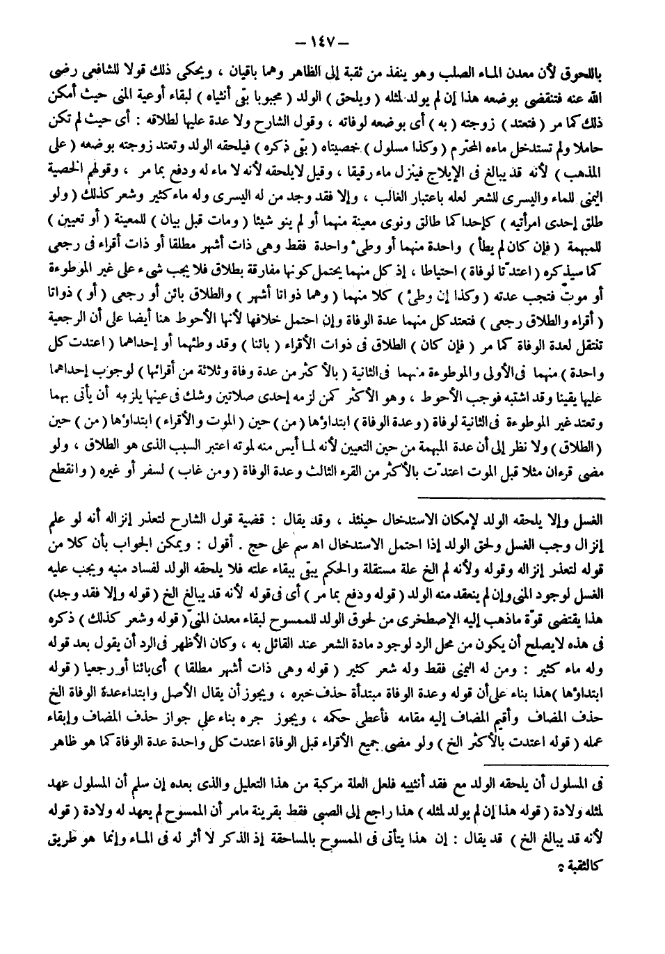أَقُولُ: وَيُمْكِنُ الْجَوَابُ بِأَنَّ كُلًّا مِنْ قَوْلِهِ لِتَعَذُّرِ إنْزَالِهِ وَقَوْلِهِ وَلِأَنَّهُ لَمْ إلَخْ عِلَّةٌ مُسْتَقِلَّةٌ وَالْحُكْمُ يَبْقَى بِبَقَاءِ عِلَّتِهِ فَلَا يَلْحَقُهُ الْوَلَدُ لِفَسَادِ مَنِيِّهِ وَيَجِبُ عَلَيْهِ الْغُسْلُ لِوُجُودِ الْمَنِيِّ وَإِنْ لَمْ يَنْعَقِدْ مِنْهُ الْوَلَدُ (قَوْلُهُ: وَدُفِعَ بِمَا مَرَّ) أَيْ فِي قَوْلِهِ لِأَنَّهُ قَدْ يُبَالِغُ إلَخْ (قَوْلُهُ: وَإِلَّا فَقَدْ وُجِدَ) هَذَا يَقْتَضِي قُوَّةُ مَا ذَهَبَ إلَيْهِ الْإِصْطَخْرِيُّ مِنْ لُحُوقِ الْوَلَدِ لِلْمَمْسُوحِ لِبَقَاءِ مَعْدِنِ الْمَنِيِّ (قَوْلُهُ: وَشَعْرٌ كَذَلِكَ) ذِكْرُهُ فِي هَذِهِ لَا يُصْلَحُ أَنْ يَكُونَ مِنْ مَحَلِّ الرَّدِّ لِوُجُودِ مَادَّةِ الشَّعْرِ عِنْدَ الْقَائِلِ بِهِ، وَكَانَ الْأَظْهَرُ فِي الرَّدِّ أَنْ يَقُولَ بَعْدَ قَوْلِهِ وَلَهُ مَاءٌ كَثِيرٌ: وَمَنْ لَهُ الْيُمْنَى فَقَطْ وَلَهُ شَعْرٌ كَثِيرٌ