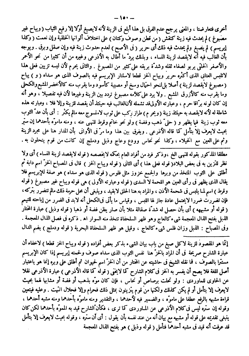 ـــــــــــــــــــــــــــــSمُطْلَقًا الْمَذْكُورِ بِقَوْلِهِ لِلنَّهْيِ إلَخْ، وَذِكْرُ فَرْدٍ مِنْ أَفْرَادِ الْعَامِّ بِحُكْمِهِ لَا يُخَصِّصُهُ (قَوْلُهُ: لَا يُقْصَدُ لِزِينَةِ النِّسَاءِ) أَيْ وَلَا نَظَرَ لِلتَّزَيُّنِ بِهِ فِي بَعْضِ الْبِلَادِ (قَوْلُهُ: فَعَلَى هَذَا) أَيْ الثَّانِي (قَوْلُهُ: وَيُبَاحُ الْخَزُّ) قَالَ فِي الْمِصْبَاحِ الْخَزُّ اسْمُ دَابَّةٍ ثُمَّ أُطْلِقَ عَلَى الثَّوْبِ الْمُتَّخَذِ مِنْ وَبَرِهَا وَالْجَمْعُ خُزُوزٌ مِثْلُ فُلُوسٌ (قَوْلُهُ: الَّذِي هُوَ سَدَاهُ) هُوَ صِفَةٌ لِلْإِبْرَيْسَمِ فَلَا يُقَالُ الَّذِي يَظْهَرُ فِي رَأْيِ الْعَيْنِ هُوَ اللُّحْمَةُ لَا السَّدَى (قَوْلُهُ: وَعِبَارَتُهُ الْأُولَى) هِيَ قَوْلُهُ وَيُبَاحُ غَيْرُ مَصْبُوغٍ (قَوْلُهُ: وَقُرْطٌ) اسْمٌ لِمَا يُلْبَسُ فِي شَحْمَةِ الْأُذُنِ، وَالْمُرَادُ بِهِ هُنَا الْحَلَقُ لَا بِقَيْدٍ، وَيَنْبَغِي أَنَّ مَحَلَّ حُرْمَةِ ذَلِكَ مَا لَمْ تَتَضَرَّرْ بِتَرْكِهِ، فَإِنْ تَضَرَّرَتْ ضَرَرًا لَا يُحْتَمَلُ عَادَةً جَازَ لَهَا اللُّبْسُ، وَقِيَاسُ مَا يَأْتِي فِي الْكُحْلِ أَنَّهُ لَا بُدَّ فِي الضَّرَرِ مِنْ إبَاحَتِهِ لِلتَّيَمُّمِ (قَوْلُهُ: أَوْ مُشَبَّهِهِ) أَيْ بِأَنْ حَصَلَ لَهُ شِدَّةُ صِقَالَةٍ مَثَلًا بِأَنْ صَارَ يُظَنُّ فِضَّةً أَوْ ذَهَبًا (قَوْلُهُ: وَذَبْلٍ) عِبَارَةُ الْمُخْتَارِ الذَّبْلُ بِفَتْحِ الذَّالِ الْمُعْجَمَةِ شَيْءٌ كَالْعَاجِ وَهُوَ ظَهْرُ السُّلَحْفَاةِ يُتَّخَذُ مِنْهُ السِّوَارُ اهـ.