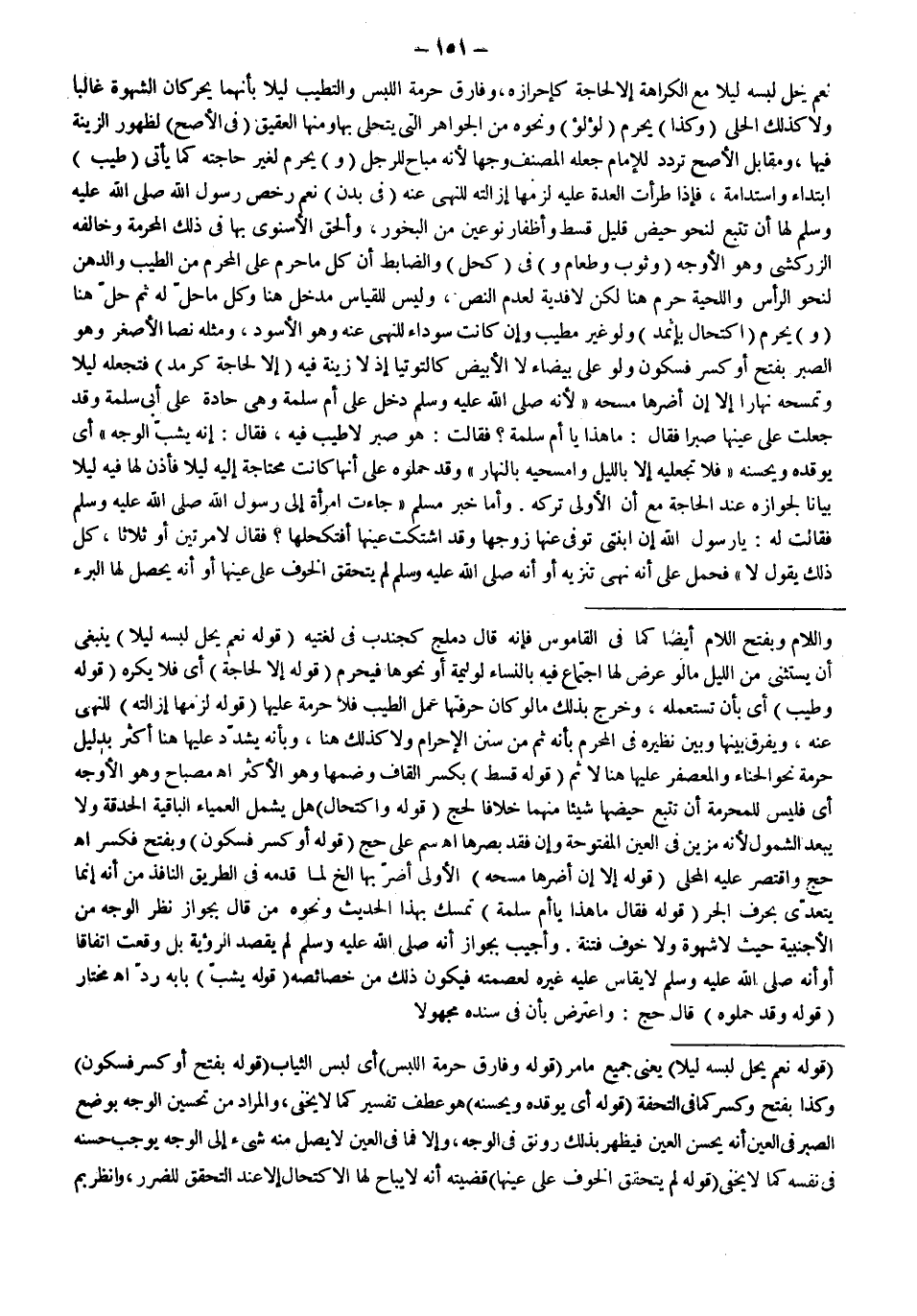 ـــــــــــــــــــــــــــــSوَاللَّامِ وَبِفَتْحِ اللَّامِ أَيْضًا كَمَا فِي الْقَامُوسِ فَإِنَّهُ قَالَ دُمْلُجٌ كَجُنْدُبٍ فِي لُغَتَيْهِ (قَوْلُهُ: نَعَمْ يَحِلُّ لُبْسُهُ لَيْلًا) يَنْبَغِي أَنْ يُسْتَثْنَى مِنْ اللَّيْلِ مَا لَوْ عَرَضَ لَهَا اجْتِمَاعٌ فِيهِ بِالنِّسَاءِ لِوَلِيمَةٍ أَوْ نَحْوِهَا فَيَحْرُمُ (قَوْلُهُ إلَّا لِحَاجَةٍ) أَيْ فَلَا يُكْرَهُ (قَوْلُهُ: وَطِيبٌ) أَيْ بِأَنْ تَسْتَعْمِلَهُ، وَخَرَجَ بِذَلِكَ مَا لَوْ كَانَ حِرْفَتُهَا عَمَلَ الطِّيبِ فَلَا حُرْمَةَ عَلَيْهَا (قَوْلُهُ: لَزِمَهَا إزَالَتُهُ) لِلنَّهْيِ عَنْهُ، وَيُفَرَّقُ بَيْنَهَا وَبَيْنَ نَظِيرِهِ فِي الْمُحْرِمِ بِأَنَّهُ ثَمَّ مِنْ سُنَنِ الْإِحْرَامِ وَلَا كَذَلِكَ هُنَا، وَبِأَنَّهُ يُشَدَّدُ عَلَيْهَا هُنَا أَكْثَرَ بِدَلِيلِ حُرْمَةِ نَحْوِ الْحِنَّاءِ وَالْمُعَصْفَرِ عَلَيْهَا هُنَا لَا ثَمَّ (قَوْلُهُ قِسْطٍ) بِكَسْرِ الْقَافِ وَضَمِّهَا وَهُوَ الْأَكْثَرُ اهـ مِصْبَاحٌ وَهُوَ الْأَوْجَهُ أَيْ فَلَيْسَ لِلْمُحْرِمَةِ أَنْ تَتْبَعَ حَيْضَهَا شَيْئًا مِنْهُمَا خِلَافًا لحج (قَوْلُهُ: وَاكْتِحَالٌ) هَلْ يَشْمَلُ الْعَمْيَاءَ الْبَاقِيَةَ الْحَدَقَةِ وَلَا يَبْعُدُ الشُّمُولُ لِأَنَّهُ مُزَيِّنٌ فِي الْعَيْنِ الْمَفْتُوحَةِ وَإِنْ فُقِدَ بَصَرُهَا اهـ سم عَلَى حَجّ (قَوْلُهُ: أَوْ كَسْرٍ فَسُكُونٍ) وَبِفَتْحٍ فَكَسْرٍ اهـ حَجّ وَاقْتَصَرَ عَلَيْهِ الْمَحَلِّيُّ (قَوْلُهُ: إلَّا إنْ أَضَرَّهَا مَسْحُهُ) الْأَوْلَى أَضَرَّ بِهَا إلَخْ لِمَا قَدَّمَهُ فِي الطَّرِيقِ النَّافِذِ مِنْ أَنَّهُ إنَّمَا يَتَعَدَّى بِحَرْفِ الْجَرِّ (قَوْلُهُ: فَقَالَ مَا هَذَا يَا أُمَّ سَلَمَةَ) تَمَسَّكَ بِهَذَا الْحَدِيثِ وَنَحْوِهِ مَنْ قَالَ بِجَوَازِ نَظَرِ الْوَجْهِ مِنْ الْأَجْنَبِيَّةِ حَيْثُ لَا شَهْوَةَ وَلَا خَوْفَ فِتْنَةٍ.