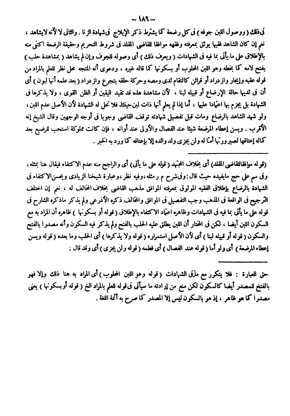 ـــــــــــــــــــــــــــــSقَوْلُهُ: مُوَافِقًا لِلْقَاضِي الْمُقَلِّدِ) أَيْ بِخِلَافِ الْمُجْتَهِدِ (قَوْلُهُ: عَلَى مَا يَأْتِي) أَيْ وَالرَّاجِحُ مِنْهُ عَدَمُ الِاكْتِفَاءِ فَيُقَالُ هُنَا بِمِثْلِهِ، وَفِي سم عَلَى حَجّ مَا يُفِيدُهُ حَيْثُ قَالَ: وَفِي شَرْحِ مَرَّ مِثْلُهُ، وَفِيهِ نَظَرٌ، وَعِبَارَةُ شَيْخِنَا الزِّيَادِيِّ وَيَحْسُنُ الِاكْتِفَاءُ فِي الشَّهَادَةِ بِالرَّضَاعِ بِإِطْلَاقِ الْفَقِيهِ الْمَوْثُوقِ بِمَعْرِفَتِهِ الْمُوَافِقِ مَذْهَبَ الْقَاضِي بِخِلَافِ الْمُخَالِفِ لَهُ، نَعَمْ إنْ اخْتَلَفَ التَّرْجِيحُ فِي الْوَاقِعَةِ فِي الْمَذْهَبِ وَجَبَ التَّفْصِيلُ فِي الْمُوَافِقِ وَالْمُخَالِفِ ذَكَرَهُ الْأَذْرَعِيُّ وَلَمْ يَذْكُرْ مَا ذَكَرَهُ الشَّارِحُ فِي قَوْلِهِ عَلَى مَا يَأْتِي بِمَا فِيهِ فِي الشَّهَادَاتِ وَظَاهِرُهُ اعْتِمَادُ الِاكْتِفَاءِ بِالْإِطْلَاقِ (قَوْلُهُ: أَوْ بِسُكُونِهَا) ظَاهِرُهُ أَنَّ الْمُرَادَ بِهِ مَعَ السُّكُونِ اللَّبَنُ أَيْضًا، لَكِنْ فِي الْمُخْتَارِ أَنَّ اللَّبَنَ يُطْلَقُ عَلَيْهِ الْحَلَبُ بِالْفَتْحِ وَلَمْ يُذْكَرْ فِيهِ السُّكُونُ وَأَنَّهُ مَصْدَرٌ بِالْفَتْحِ وَالسُّكُونِ (قَوْلُهُ: أَوْ قَبِيلَهُ لَبَنًا) أَيْ لِأَنَّ الْأَصْلَ اسْتِمْرَارُهُ (قَوْلُهُ: وَلَا يَذْكُرُهَا) أَيْ الْحَلَبُ وَمَا بَعْدَهُ (قَوْلُهُ: وَيُسَنُّ إعْطَاءُ الْمُرْضِعَةِ) أَيْ وَلَوْ أُمًّا (قَوْلُهُ: عِنْدَ الْفِصَالِ) أَيْ فَطْمَهُ (قَوْلُهُ: وَلَنْ يَجْزِيَ) أَيْ وَقَدْ قَالَ.
