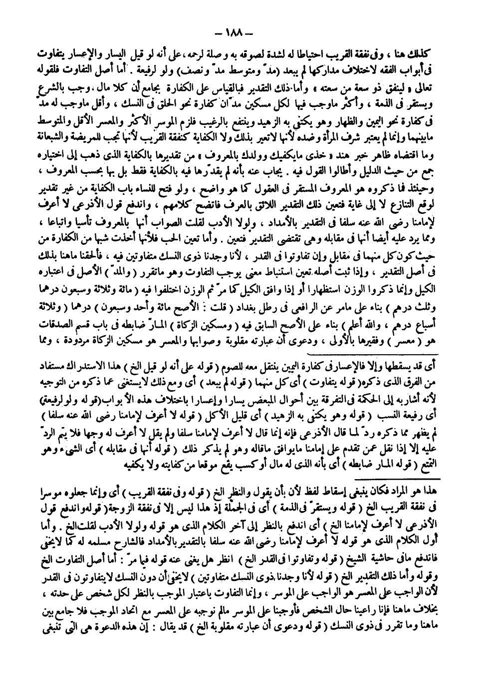 (قَوْلُهُ: وَانْدَفَعَ قَوْلُ الْأَذْرَعِيِّ لَا أَعْرِفُ لِإِمَامِنَا إلَخْ.) أَيْ انْدَفَعَ بِالنَّظَرِ إلَى آخِرِ الْكَلَامِ الَّذِي هُوَ قَوْلُهُ: وَلَوْلَا الْأَدَبُ لَقُلْت إلَخْ. وَأَمَّا أَوَّلُ الْكَلَامِ الَّذِي هُوَ قَوْلُهُ: لَا أَعْرِفُ لِإِمَامِنَا - رَضِيَ اللَّهُ عَنْهُ - سَلَفًا بِالتَّقْدِيرِ بِالْأَمْدَادِ فَالشَّارِحُ مُسَلِّمُهُ لَهُ كَمَا لَا يَخْفَى فَانْدَفَعَ مَا فِي حَاشِيَةِ الشَّيْخِ (قَوْلُهُ: وَتَفَاوَتُوا فِي الْقَدْرِ إلَخْ.) اُنْظُرْ هَلْ يُغْنِي عَنْهُ قَوْلُهُ: فِيمَا مَرَّ: أَمَّا أَصْلُ التَّفَاوُتِ إلَخْ. وَقَوْلُهُ: وَأَمَّا ذَلِكَ التَّقْدِيرُ إلَخْ. (قَوْلُهُ:؛ لِأَنَّا وَجَدْنَا ذَوِي النُّسُكِ مُتَفَاوِتِينَ) لَا يَخْفَى أَنَّ دُونَ النُّسُكِ لَا يَتَفَاوَتُونَ فِي الْقَدْرِ لِأَنَّ الْوَاجِبَ عَلَى الْمُعْسِرِ هُوَ الْوَاجِبُ عَلَى الْمُوسِرِ، وَإِنَّمَا التَّفَاوُتُ بِاعْتِبَارِ الْمُوجِبِ بِالنَّظَرِ لِكُلِّ شَخْصٍ عَلَى حِدَتِهِ، بِخِلَافِ مَا هُنَا فَإِنَّا رَاعَيْنَا حَالَ الشَّخْصِ، فَأَوْجَبْنَا عَلَى الْمُوسِرِ مَا لَمْ نُوجِبْهُ عَلَى الْمُعْسِرِ مَعَ اتِّحَادِ الْمُوجِبِ فَلَا جَامِعَ بَيْنَ مَا هُنَا وَمَا تَقَرَّرَ فِي ذَوِي النُّسُكِ.