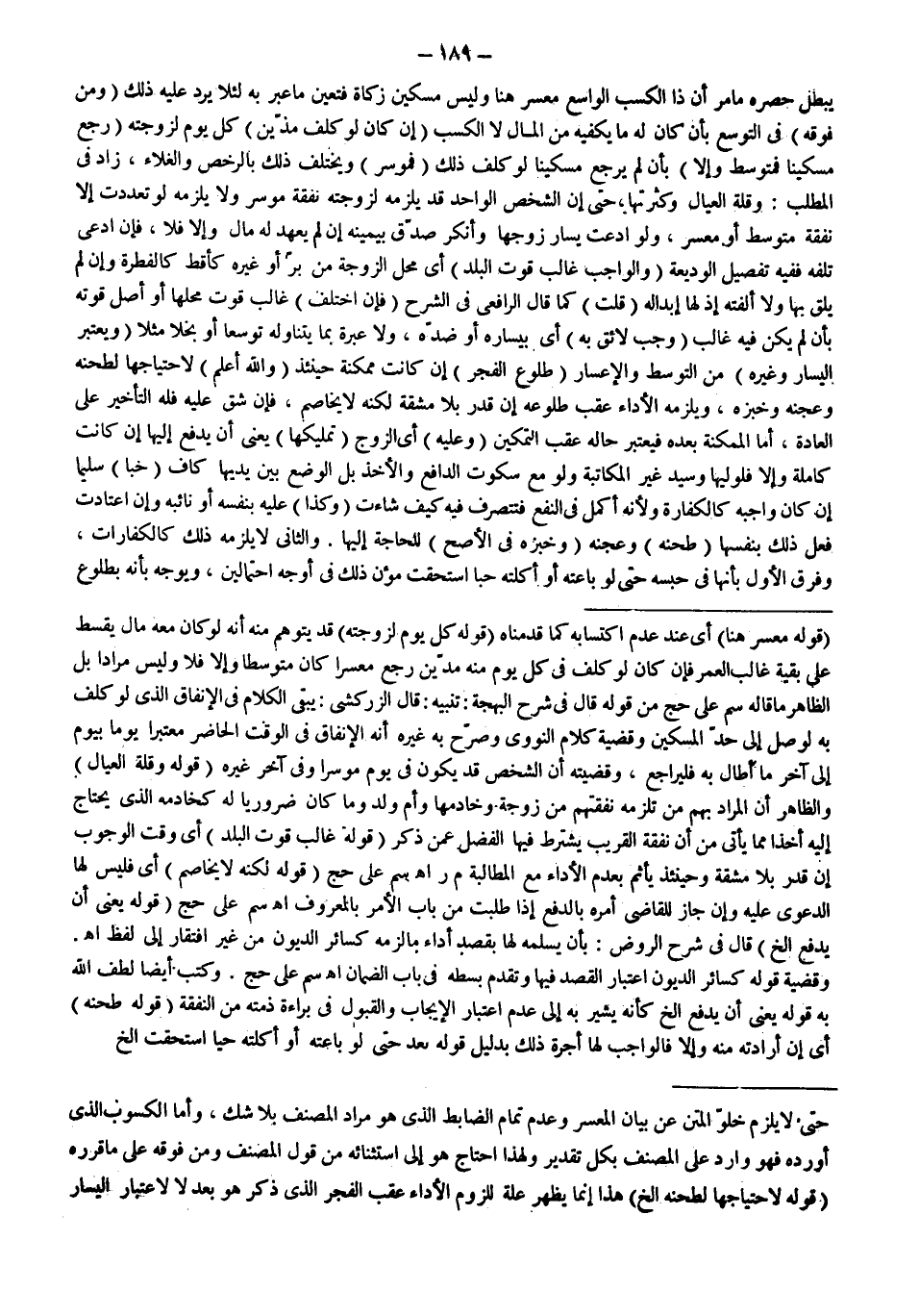 ـــــــــــــــــــــــــــــQحَتَّى لَا يَلْزَمَ خُلُوُّ الْمَتْنِ عَنْ بَيَانِ الْمُعْسِرِ وَعَدَمُ تَمَامِ الضَّابِطِ الَّذِي هُوَ مُرَادُ الْمُصَنِّفِ بِلَا شَكٍّ، وَأَمَّا الْكُسُوبُ الَّذِي أَوْرَدَهُ فَهُوَ وَارِدٌ عَلَى الْمُصَنِّفِ بِكُلِّ تَقْدِيرٍ وَلِهَذَا احْتَاجَ هُوَ إلَى اسْتِثْنَائِهِ مِنْ قَوْلِ الْمُصَنِّفِ وَمَنْ فَوْقَهُ مَا قَرَّرَهُ (قَوْلُهُ:؛ لِاحْتِيَاجِهَا لِطَحْنِهِ إلَخْ.) هَذَا إنَّمَا يَظْهَرُ عِلَّةً لِلُزُومِ الْأَدَاءِ عَقِبَ الْفَجْرِ الَّذِي ذَكَرَ هُوَ بَعْدُ لَا لِاعْتِبَارِ الْيَسَارِ