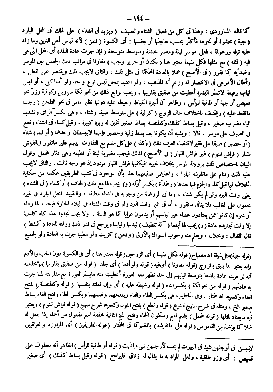 كَمَا قَالَهُ الْمَاوَرْدِيُّ، وَهَذَا فِي كُلٍّ مِنْ فَصْلِ الشِّتَاءِ وَالصَّيْفِ (وَيَزِيدُ فِي الشِّتَاءِ) عَلَى ذَلِكَ فِي الْمَحَلِّ الْبَارِدِ (جُبَّةً) مَحْشُوَّةً أَوْ نَحْوَهَا فَأَكْثَرَ بِحَسَبِ حَاجَتِهَا أَوْ جِنْسِهَا: أَيْ الْكِسْوَةُ (قُطْنٍ) لِأَنَّهُ لِبَاسُ أَهْلِ الدِّينِ وَمَا زَادَ عَلَيْهِ تَرَفُّهٌ وَرُعُونَةٌ، فَعَلَى مُوسِرٍ لَيِّنَةٌ وَمُعْسِرٍ خَشِنَةٌ وَمُتَوَسِّطٌ مُتَوَسِّطَةٌ (فَإِنْ جَرَتْ عَادَةُ الْبَلَدِ) أَيْ الْمَحَلِّ الَّتِي هِيَ فِيهِ (لِمِثْلِهِ) مَعَ مِثْلِهَا فَكُلٌّ مِنْهُمَا مُعْتَبَرٌ هُنَا (بِكَتَّانٍ أَوْ حَرِيرٍ وَجَبَ) مُفَاوِتًا فِي مَرَاتِبِ ذَلِكَ الْجِنْسِ بَيْنَ الْمُوسِرِ وَضِدَّيْهِ كَمَا تَقَرَّرَ (فِي الْأَصَحِّ) عَمَلًا بِالْعَادَةِ الْمُحْكَمَةِ فِي مِثْلِ ذَلِكَ، وَالثَّانِي لَا يَجِبُ ذَلِكَ وَيُقْتَصَرُ عَلَى الْقُطْنِ، وَأَطَالَ الْأَذْرَعِيُّ فِي الِانْتِصَارِ لَهُ وَزَعَمَ أَنَّهُ الْمَذْهَبُ، وَلَوْ اُعْتِيدَ بِمَحَلِّ لُبْسِ نَوْعٍ وَاحِدٍ وَلَوْ أُدْمًا كَفَى، أَوْ لُبْسِ ثِيَابٍ رَفِيعَةٍ لَا تَسْتُرُ الْبَشَرَةَ أُعْطِيت مِنْ صَفِيقٍ يُقَارِبُهَا، وَيَجِبُ تَوَابِعُ ذَلِكَ مِنْ نَحْوِ تِكَّةِ سَرَاوِيلَ وَكُوفِيَّةٍ وَزِرٍّ نَحْوَ قَمِيصٍ أَوْ جُبَّةٍ أَوْ طَاقِيَّةٍ لِلرَّأْسِ، وَظَاهِرٌ أَنَّ أُجْرَةَ الْخَيَّاطِ وَخَيْطَهُ عَلَيْهِ دُونَهَا نَظِيرَ مَا مَرَّ فِي نَحْوِ الطَّحْنِ.
