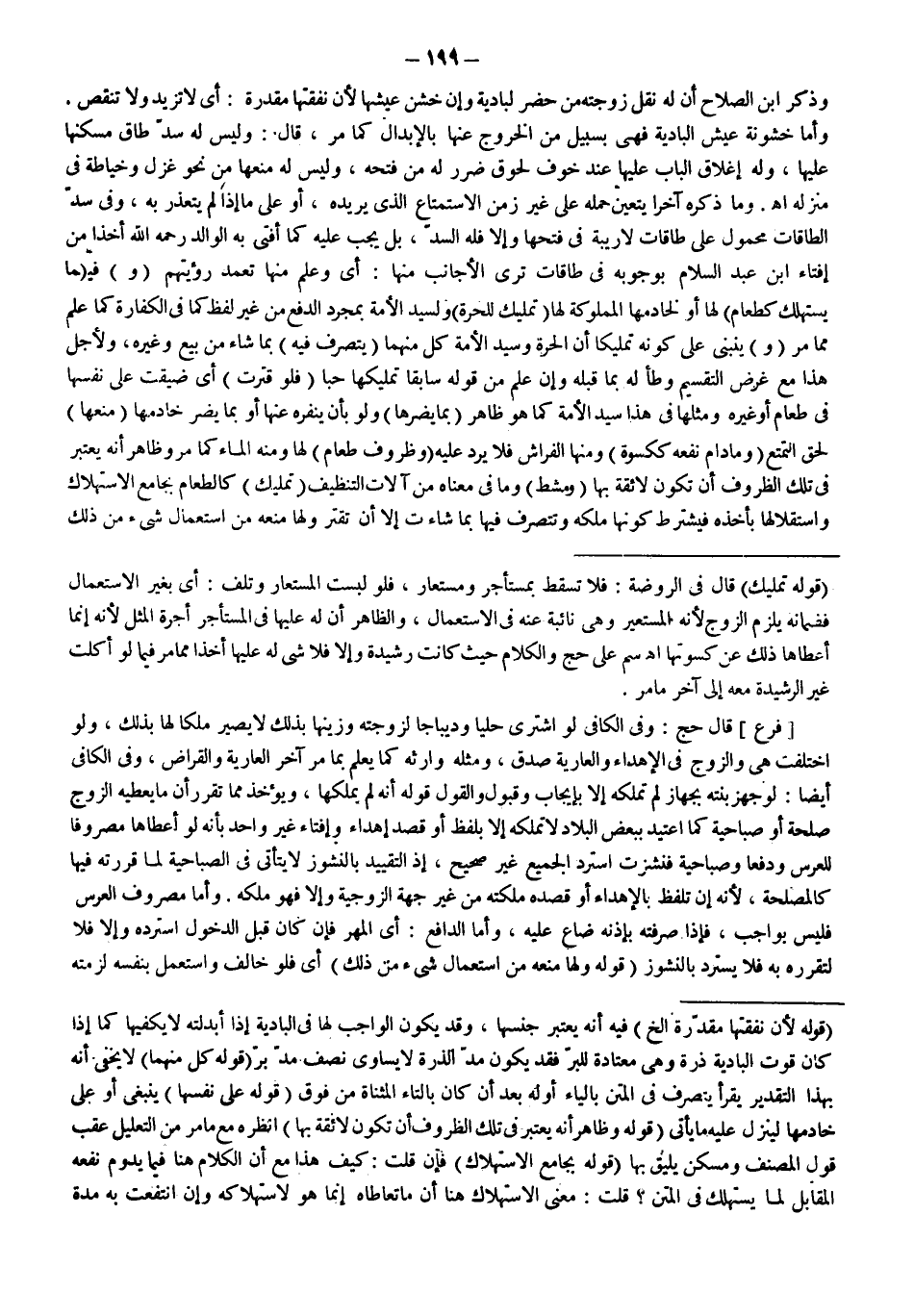 وَمَا ذَكَرَهُ آخِرًا يَتَعَيَّنُ حَمْلُهُ عَلَى غَيْرِ زَمَنِ الِاسْتِمْتَاعِ الَّذِي يُرِيدُهُ، أَوْ عَلَى مَا إذَا لَمْ يَتَعَذَّرْ بِهِ، وَفِي سَدِّ الطَّاقَاتِ مَحْمُولٌ عَلَى طَاقَاتٍ لَا رِيبَةَ فِي فَتْحِهَا وَإِلَّا فَلَهُ السَّدُّ، بَلْ يَجِبُ عَلَيْهِ كَمَا أَفْتَى بِهِ الْوَالِدُ - رَحِمَهُ اللَّهُ - أَخْذًا مِنْ إفْتَاءِ ابْنِ عَبْدِ السَّلَامِ بِوُجُوبِهِ فِي طَاقَاتٍ تَرَى الْأَجَانِبَ مِنْهَا: أَيْ وَعُلِمَ مِنْهَا تَعَمُّدُ رُؤْيَتِهِمْ (وَ) (فِي) مَا يُسْتَهْلَكُ (كَطَعَامٍ) لَهَا أَوْ لِخَادِمِهَا الْمَمْلُوكَةِ لَهَا (تَمْلِيكٌ لِلْحُرَّةِ) وَلِسَيِّدِ الْأَمَةِ بِمُجَرَّدِ الدَّفْعِ مِنْ غَيْرِ لَفْظٍ كَمَا فِي الْكَفَّارَةِ كَمَا عُلِمَ مِمَّا مَرَّ (وَ) يَنْبَنِي عَلَى كَوْنِهِ تَمْلِيكًا أَنَّ الْحُرَّةَ وَسَيِّدَ الْأَمَةِ كُلٌّ مِنْهُمَا (يَتَصَرَّفُ فِيهِ) بِمَا شَاءَ مِنْ بَيْعٍ وَغَيْرِهِ، وَلِأَجْلِ هَذَا مَعَ غَرَضِ التَّقْسِيمِ وَطَّأَ لَهُ بِمَا قَبْلَهُ وَإِنْ عُلِمَ مِنْ قَوْلِهِ سَابِقًا تَمْلِيكُهَا حَبًّا (فَلَوْ قَتَرَتْ) أَيْ ضَيَّقَتْ عَلَى نَفْسِهَا فِي طَعَامٍ أَوْ غَيْرِهِ وَمِثْلُهَا فِي هَذَا سَيِّدُ الْأَمَةِ كَمَا هُوَ ظَاهِرٌ (بِمَا يَضُرُّهَا) وَلَوْ بِأَنْ يُنَفِّرَهُ عَنْهَا أَوْ بِمَا يَضُرُّ خَادِمَهَا (مَنَعَهَا) لِحَقِّ التَّمَتُّعِ