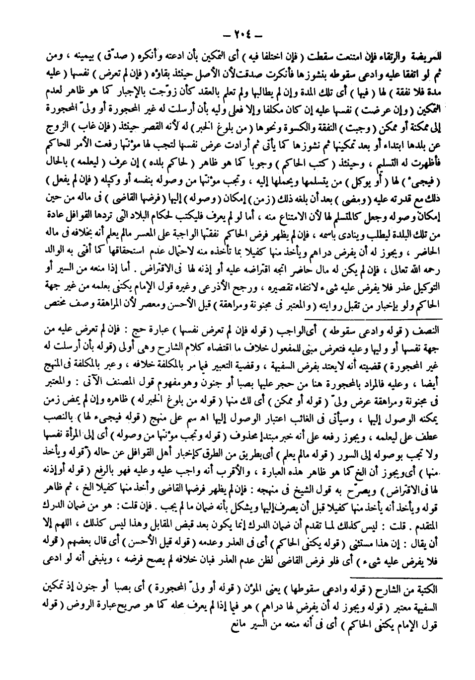 ـــــــــــــــــــــــــــــQالْكَتَبَةُ مِنْ الشَّارِحِ (قَوْلُهُ: وَادَّعَى سُقُوطَهَا) يَعْنِي: الْمُؤَنَ (قَوْلُهُ: أَوْ وَلِيَّ الْمَحْجُورَةِ) أَيْ بِصِبًا أَوْ جُنُونٍ إذْ تَمْكِينُ السَّفِيهَةِ مُعْتَبَرٌ (قَوْلُهُ: وَيَجُوزُ لَهُ أَنْ يَفْرِضَ لَهَا دَرَاهِمَ) هُوَ فِيمَا إذَا لَمْ يَعْرِفْ مَحَلَّهُ كَمَا هُوَ صَرِيحُ عِبَارَةِ الرَّوْضِ (قَوْلُهُ: قَوْلُ الْإِمَامِ يَكْتَفِي الْحَاكِمُ) أَيْ فِي أَنَّهُ مَنَعَهُ مِنْ السِّيَرِ مَانِعٌ