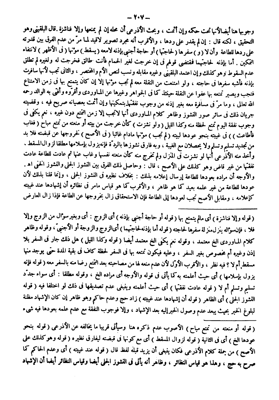 قَالَ الْبُلْقِينِيُّ وَهُوَ التَّحْقِيقُ، لَكِنَّهُ قَالَ: إنْ لَمْ يَقْدِرْ عَلَى رَدِّهَا، وَالْأَقْرَبُ أَنَّهُ مُجَرَّدُ تَصْوِيرٍ لَا قَيْدٌ لِمَا مَرَّ مِنْ عَدَمِ الْفَرْقِ بَيْنَ قُدْرَتِهِ عَلَى رَدِّهَا لِلطَّاعَةِ وَأَنْ لَا (وَ) سَفَرُهَا (لِحَاجَتِهَا) أَوْ حَاجَةِ أَجْنَبِيٍّ بِإِذْنِهِ لَا مَعَهُ (يُسْقِطُ) مُؤَنَهَا (فِي الْأَظْهَرِ) لِانْتِفَاءِ التَّمْكِينِ.