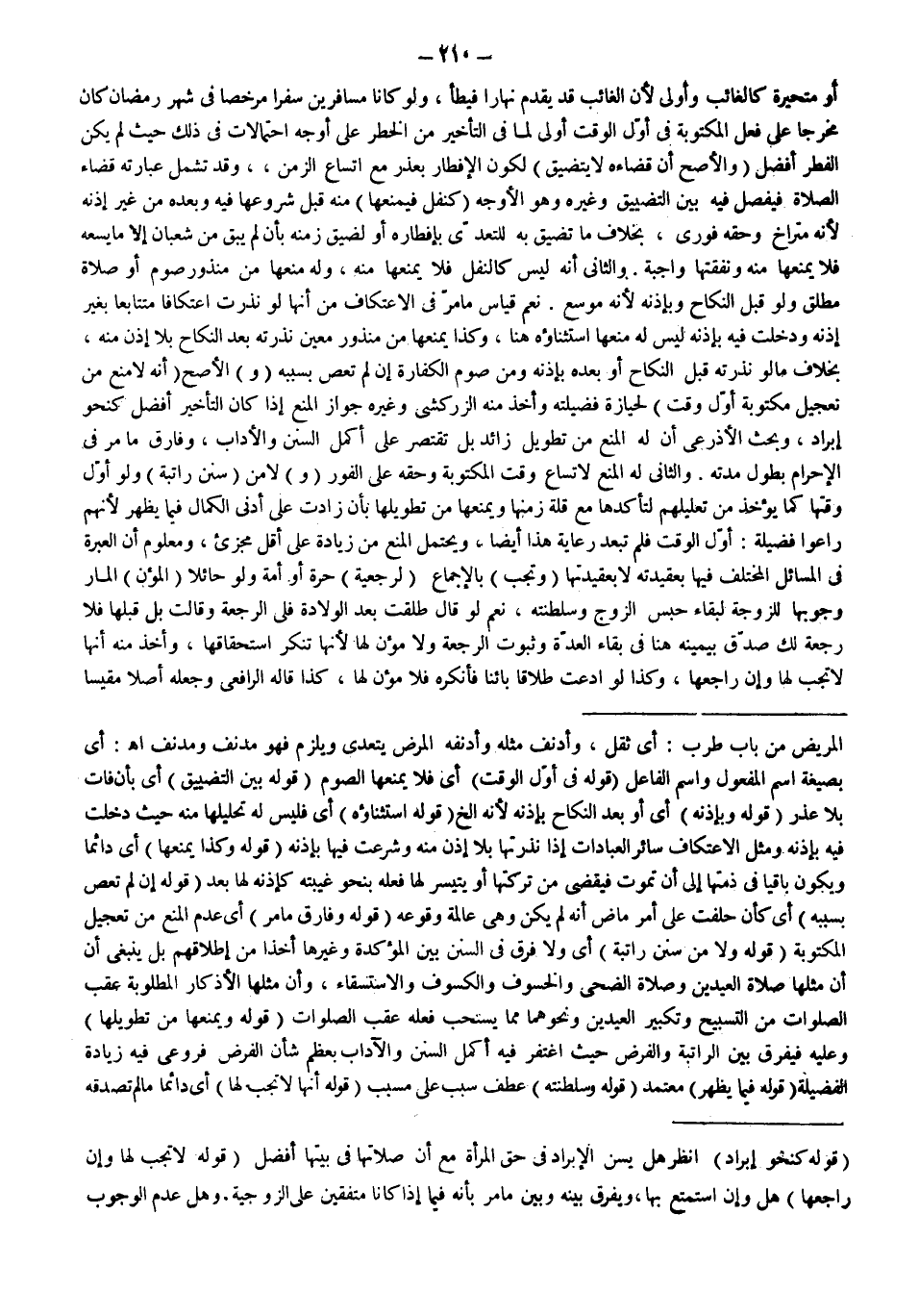 نَعَمْ قِيَاسُ مَا مَرَّ فِي الِاعْتِكَافِ مِنْ أَنَّهَا لَوْ نَذَرَتْ اعْتِكَافًا مُتَتَابِعًا بِغَيْرِ إذْنِهِ وَدَخَلَتْ فِيهِ بِإِذْنِهِ لَيْسَ لَهُ مَنْعُهَا اسْتِثْنَاؤُهُ هُنَا، وَكَذَا يَمْنَعُهَا مِنْ مَنْذُورٍ مُعَيَّنٍ نَذَرَتْهُ بَعْدَ النِّكَاحِ بِلَا إذْنٍ مِنْهُ، بِخِلَافِ مَا لَوْ نَذَرَتْهُ قَبْلَ النِّكَاحِ أَوْ بَعْدَهُ بِإِذْنِهِ وَمِنْ صَوْمِ الْكَفَّارَةِ إنْ لَمْ تَعْصِ بِسَبَبِهِ (وَ) الْأَصَحُّ (أَنَّهُ لَا مَنْعَ مِنْ تَعْجِيلِ مَكْتُوبَةٍ أَوَّلَ وَقْتٍ) لِحِيَازَةِ فَضِيلَتِهِ وَأَخَذَ مِنْهُ الزَّرْكَشِيُّ وَغَيْرُهُ جَوَازَ الْمَنْعِ إذَا كَانَ التَّأْخِيرُ أَفْضَلَ كَنَحْوِ إبْرَادٍ، وَبَحَثَ الْأَذْرَعِيُّ أَنَّ لَهُ الْمَنْعَ مِنْ تَطْوِيلٍ زَائِدٍ بَلْ تَقْتَصِرُ عَلَى أَكْمَلِ السُّنَنِ وَالْآدَابِ، وَفَارَقَ مَا مَرَّ فِي الْإِحْرَامِ بِطُولِ مُدَّتِهِ.