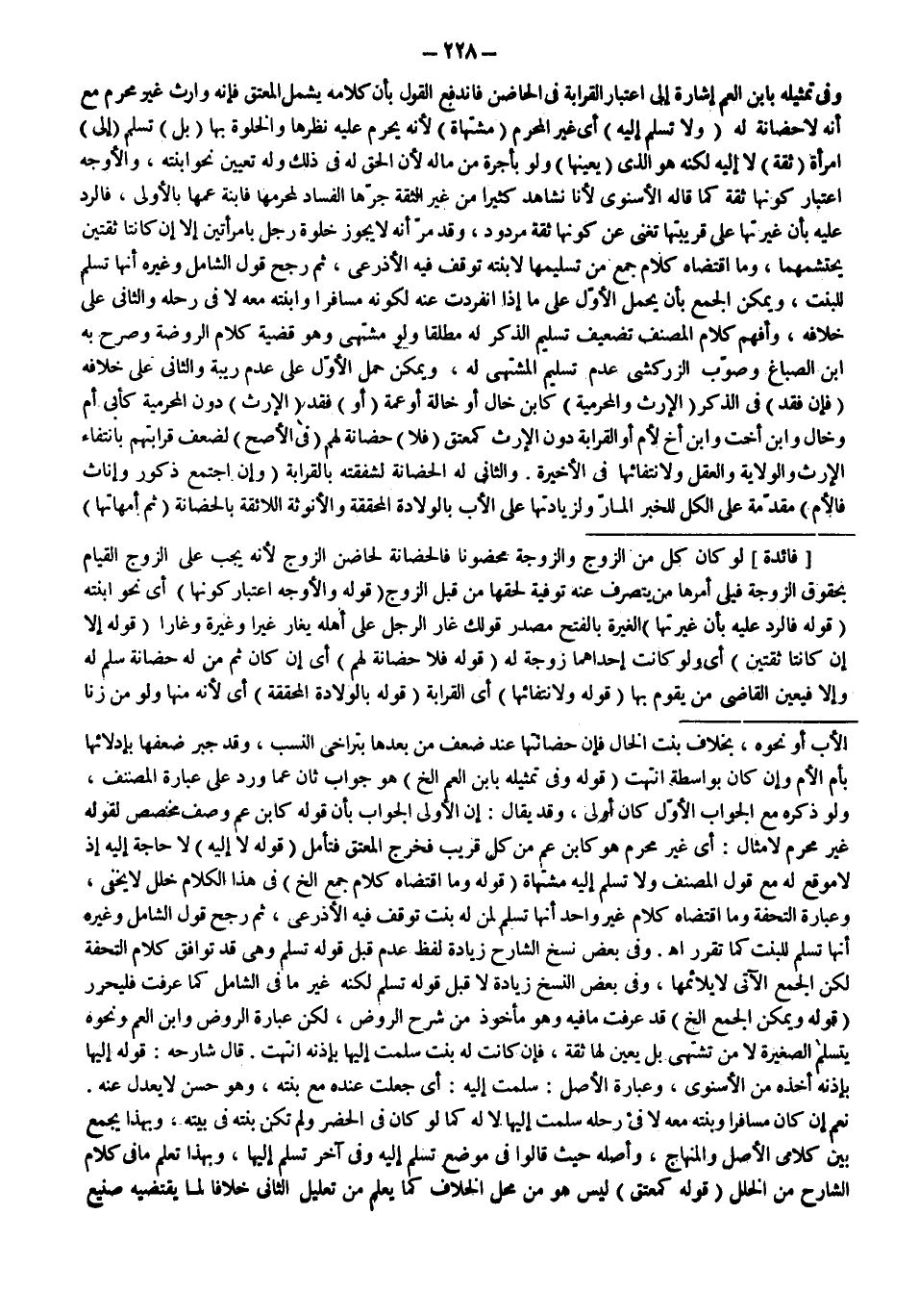 ـــــــــــــــــــــــــــــQالْأَبُ أَوْ نَحْوُهُ، بِخِلَافِ بِنْتِ الْخَالِ فَإِنَّ حَضَانَتَهَا عِنْدَ ضَعْفِ مَنْ بَعْدَهَا بِتَرَاخِي النَّسَبِ، وَقَدْ جُبِرَ ضَعْفُهَا بِإِدْلَائِهَا بِأُمِّ الْأُمِّ، وَإِنْ كَانَ بِوَاسِطَةٍ انْتَهَتْ (قَوْلُهُ: وَفِي تَمْثِيلِهِ بِابْنِ الْعَمِّ إلَخْ.) هُوَ جَوَابٌ ثَانٍ عَمَّا وَرَدَ عَلَى عِبَارَةِ الْمُصَنِّفِ، وَلَوْ ذَكَرَهُ مَعَ الْجَوَابِ الْأَوَّلِ كَانَ أَوْلَى، وَقَدْ يُقَالُ: إنَّ الْأَوْلَى الْجَوَابُ بِأَنَّ قَوْلَهُ كَابْنِ عَمٍّ وَصْفٌ مُخَصِّصٌ لِقَوْلِهِ غَيْرُ مَحْرَمٍ لَا مِثَالَ: أَيْ غَيْرُ مَحْرَمٍ هُوَ كَابْنِ عَمٍّ مِنْ كُلِّ قَرِيبٍ فَخَرَجَ الْمُعْتِقُ فَتَأَمَّلْ (قَوْلُهُ: لَا إلَيْهِ) لَا حَاجَةَ إلَيْهِ إذْ لَا مَوْقِعَ لَهُ مَعَ قَوْلِ الْمُصَنِّفِ وَلَا تُسَلَّمُ إلَيْهِ مُشْتَهَاةٌ (قَوْلُهُ: وَمَا اقْتَضَاهُ كَلَامُ جَمْعٍ إلَخْ.) فِي هَذَا الْكَلَامِ خَلَلٌ لَا يَخْفَى، وَعِبَارَةُ التُّحْفَةِ وَمَا اقْتَضَاهُ كَلَامُ غَيْرِ وَاحِدٍ أَنَّهَا تُسَلَّمُ لِمَنْ لَهُ بِنْتٌ تَوَقَّفَ فِيهِ الْأَذْرَعِيُّ، ثُمَّ رُجِّحَ قَوْلُ الشَّامِلِ وَغَيْرُهُ أَنَّهَا تُسَلَّمُ لِلْبِنْتِ كَمَا تَقَرَّرَ. اهـ.