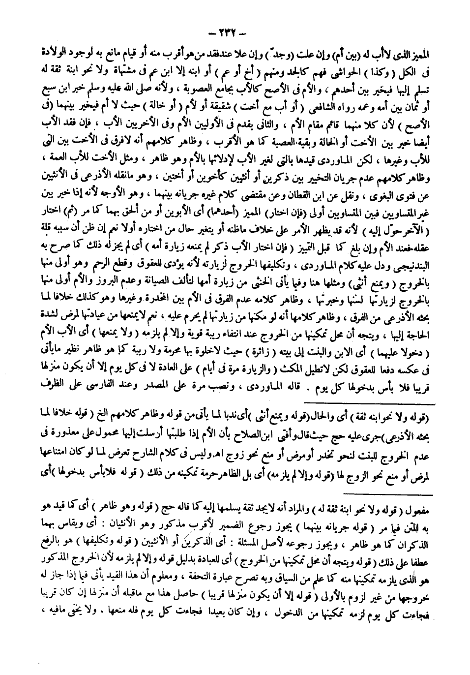 ـــــــــــــــــــــــــــــQ (قَوْلُهُ: وَلَا نَحْوُ ابْنَةٍ ثِقَةٍ لَهُ) وَالْمُرَادُ أَنَّهُ لَا يَجِدُ ثِقَةً يُسَلِّمُهَا إلَيْهِ كَمَا قَالَهُ حَجّ (قَوْلُهُ: وَهُوَ ظَاهِرٌ) أَيْ كَمَا قَيَّدَ هُوَ بِهِ الْمَتْنَ فِيمَا مَرَّ (قَوْلُهُ: جَرَيَانُهُ بَيْنَهُمَا) يَجُوزُ رُجُوعُ الضَّمِيرِ لِأَقْرَبِ مَذْكُورٍ وَهُوَ الْأُنْثَيَانِ: أَيْ وَيُقَاسُ بِهِمَا الذَّكَرَانِ كَمَا هُوَ ظَاهِرٌ، وَيَجُوزُ رُجُوعُهُ لِأَصْلِ الْمَسْأَلَةِ: أَيْ الذَّكَرَيْنِ أَوْ الْأُنْثَيَيْنِ (قَوْلُهُ: وَتَكْلِيفُهَا) هُوَ بِالرَّفْعِ عَطْفًا عَلَى ذَلِكَ (قَوْلُهُ: وَيُتَّجَهُ أَنَّ مَحَلَّ تَمْكِينِهَا مِنْ الْخُرُوجِ) أَيْ لِلْعِبَادَةِ بِدَلِيلِ قَوْلِهِ، وَإِلَّا لَمْ يَلْزَمْهُ لِأَنَّ الْخُرُوجَ الْمَذْكُورَ هُوَ الَّذِي يَلْزَمُهُ تَمْكِينُهَا مِنْهُ كَمَا عُلِمَ مِنْ السِّيَاقِ وَبِهِ تُصَرِّحُ عِبَارَةُ التُّحْفَةِ، وَمَعْلُومٌ أَنَّ هَذَا الْقَيْدَ يَأْتِي فِيمَا إذَا جَازَ لَهُ خُرُوجُهَا مِنْ غَيْرِ لُزُومٍ بِالْأُولَى (قَوْلُهُ: إلَّا أَنْ يَكُونَ مَنْزِلُهَا قَرِيبًا) حَاصِلُ هَذَا مَعَ مَا قَبْلَهُ أَنَّ مَنْزِلَهَا إنْ كَانَ قَرِيبًا فَجَاءَتْ كُلَّ يَوْمٍ لَزِمَهُ تَمْكِينُهَا مِنْ الدُّخُولِ، وَإِنْ كَانَ بَعِيدًا فَجَاءَتْ كُلَّ يَوْمٍ فَلَهُ مَنْعُهَا، وَلَا يَخْفَى مَا فِيهِ،