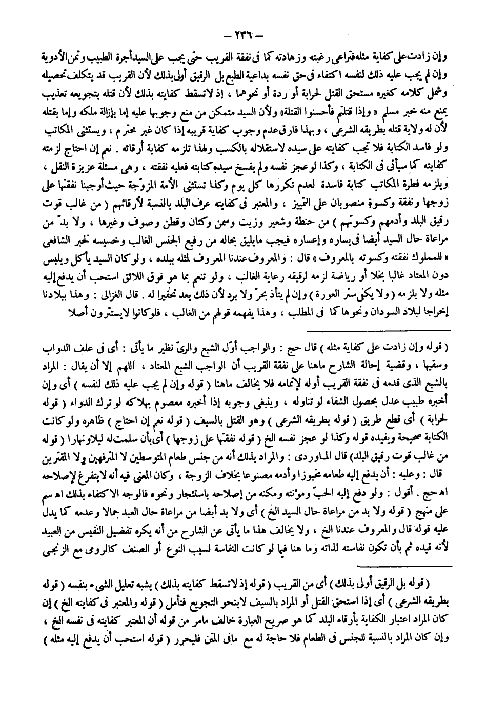 (فَصْلٌ) فِي مُؤْنَةِ الْمَمَالِيكِ وَتَوَابِعِهَا (قَوْلُهُ: بَلْ الرَّقِيقُ أَوْلَى بِذَلِكَ) أَيْ مِنْ الْقَرِيبِ (قَوْلُهُ: إذْ لَا تَسْقُطُ كِفَايَتُهُ بِذَلِكَ) يُشْبِهُ تَعْلِيلَ الشَّيْءِ بِنَفْسِهِ (قَوْلُهُ: بِطَرِيقِهِ الشَّرْعِيِّ) أَيْ إذَا اسْتَحَقَّ الْقَتْلَ أَوْ الْمُرَادَ بِالسَّيْفِ لَا بِنَحْوِ التَّجْوِيعِ فَتَأَمَّلْ (قَوْلُهُ: وَالْمُعْتَبَرُ فِي كِفَايَتِهِ إلَخْ.) إنْ كَانَ الْمُرَادُ اعْتِبَارُ الْكِفَايَةِ بِأَرِقَّاءِ الْبَلَدِ كَمَا هُوَ صَرِيحُ الْعِبَارَةِ خَالَفَ مَا مَرَّ مِنْ قَوْلِهِ أَنَّ الْمُعْتَبَرَ كِفَايَتُهُ فِي نَفْسِهِ إلَخْ. وَإِنْ كَانَ الْمُرَادُ بِالنِّسْبَةِ لِلْجِنْسِ فِي الطَّعَامِ فَلَا حَاجَةَ لَهُ مَعَ مَا فِي الْمَتْنِ فَلْيُحَرَّرْ (قَوْلُهُ: اُسْتُحِبَّ أَنْ يَدْفَعَ إلَيْهِ مِثْلَهُ)