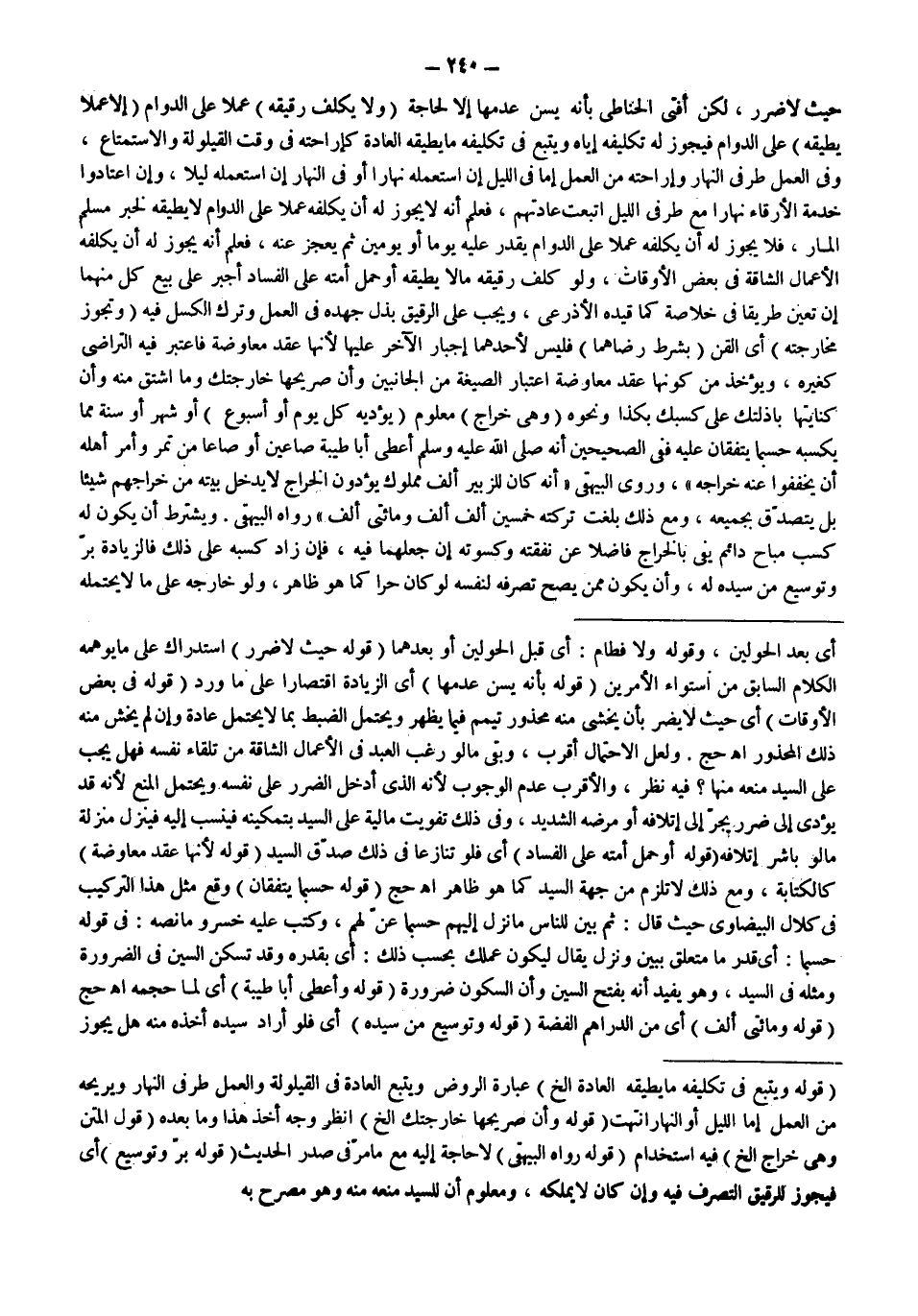 حَيْثُ لَا ضَرَرَ، لَكِنْ أَفْتَى الْحَنَّاطِيُّ بِأَنَّهُ يُسَنُّ عَدَمُهَا إلَّا لِحَاجَةٍ (وَلَا يُكَلِّفُ رَقِيقَهُ) عَمَلًا عَلَى الدَّوَامِ (إلَّا عَمَلًا يُطِيقُهُ) عَلَى الدَّوَامِ فَيَجُوزُ لَهُ تَكْلِيفُهُ إيَّاهُ وَيَتْبَعُ فِي تَكْلِيفِهِ مَا يُطِيقُهُ الْعَادَةَ كَإِرَاحَتِهِ فِي وَقْتِ الْقَيْلُولَةِ وَالِاسْتِمْتَاعِ، وَفِي الْعَمَلِ طَرَفَيْ النَّهَارِ وَإِرَاحَتِهِ مِنْ الْعَمَلِ إمَّا فِي اللَّيْلِ إنْ اسْتَعْمَلَهُ نَهَارًا أَوْ فِي النَّهَارِ إنْ اسْتَعْمَلَهُ لَيْلًا، وَإِنْ اعْتَادُوا خِدْمَةَ الْأَرِقَّاءِ نَهَارًا مَعَ طَرَفَيْ اللَّيْلِ اُتُّبِعَتْ عَادَتُهُمْ، فَعُلِمَ أَنَّهُ لَا يَجُوزُ لَهُ أَنْ يُكَلِّفَهُ عَمَلًا عَلَى الدَّوَامِ لَا يُطِيقُهُ لِخَبَرِ مُسْلِمٍ الْمَارِّ، فَلَا يَجُوزُ لَهُ أَنْ يُكَلِّفَهُ عَمَلًا عَلَى الدَّوَامِ يَقْدِرُ عَلَيْهِ يَوْمًا أَوْ يَوْمَيْنِ ثُمَّ يَعْجَزُ عَنْهُ، فَعُلِمَ أَنَّهُ يَجُوزُ لَهُ أَنْ يُكَلِّفَهُ الْأَعْمَالَ الشَّاقَّةَ فِي بَعْضِ الْأَوْقَاتِ، وَلَوْ كَلَّفَ رَقِيقَهُ مَا لَا يُطِيقُهُ أَوْ حَمَلَ أَمَتَهُ عَلَى الْفَسَادِ أُجْبِرَ عَلَى بَيْعِ كُلٍّ مِنْهُمَا إنْ تَعَيَّنَ طَرِيقًا فِي خَلَاصِهِ كَمَا قَيَّدَهُ الْأَذْرَعِيُّ، وَيَجِبُ عَلَى الرَّقِيقِ بَذْلُ جَهْدِهِ فِي الْعَمَلِ، وَتَرْكُ الْكَسَلِ فِيهِ.