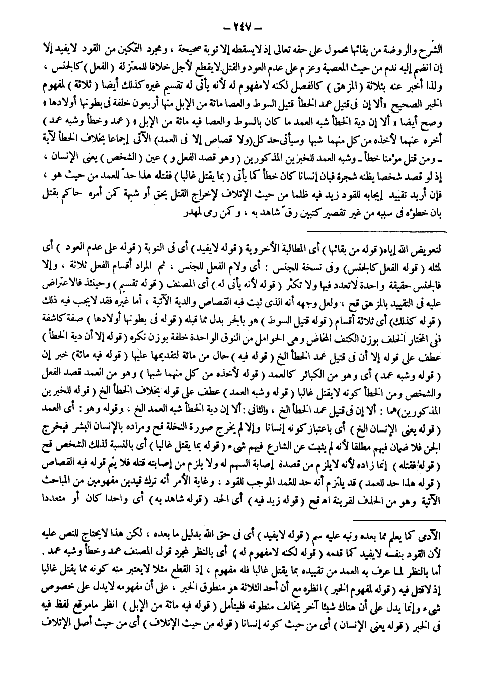 الشَّرْحِ وَالرَّوْضَةِ مِنْ بَقَائِهَا مَحْمُولٌ عَلَى حَقِّهِ تَعَالَى؛ إذْ لَا يُسْقِطُهُ إلَّا تَوْبَةٌ صَحِيحَةٌ، وَمُجَرَّدُ التَّمْكِينِ مِنْ الْقَوَدِ لَا يُفِيدُ إلَّا إنْ انْضَمَّ إلَيْهِ نَدَمٌ مِنْ حَيْثُ الْمَعْصِيَةُ وَعَزَمَ عَلَى عَدَمِ الْعَوْدِ، وَالْقَتْلُ لَا يُقْطَعُ لِأَجَلٍ خِلَافًا لِلْمُعْتَزِلَةِ (الْفِعْلُ) كَالْجِنْسِ، وَلِذَا أَخْبَرَ عَنْهُ بِثَلَاثَةٍ (الْمُزْهِقُ) كَالْفَصْلِ لَكِنَّهُ لَا مَفْهُومَ لَهُ؛ لِأَنَّهُ يَأْتِي لَهُ تَقْسِيمٌ غَيْرُهُ كَذَلِكَ أَيْضًا (ثَلَاثَةٌ) لِمَفْهُومِ الْخَبَرِ الصَّحِيحِ «أَلَا إنَّ فِي قَتِيلِ عَمْدِ الْخَطَأِ قَتِيلِ السَّوْطِ وَالْعَصَا مِائَةً مِنْ الْإِبِلِ مِنْهَا أَرْبَعُونَ خَلِفَةً فِي بُطُونِهَا أَوْلَادُهَا» وَصَحَّ أَيْضًا «أَلَا إنَّ دِيَةَ الْخَطَأِ شِبْهِ الْعَمْدِ مَا كَانَ بِالسَّوْطِ وَالْعَصَا فِيهِ مِائَةٌ مِنْ الْإِبِلِ»