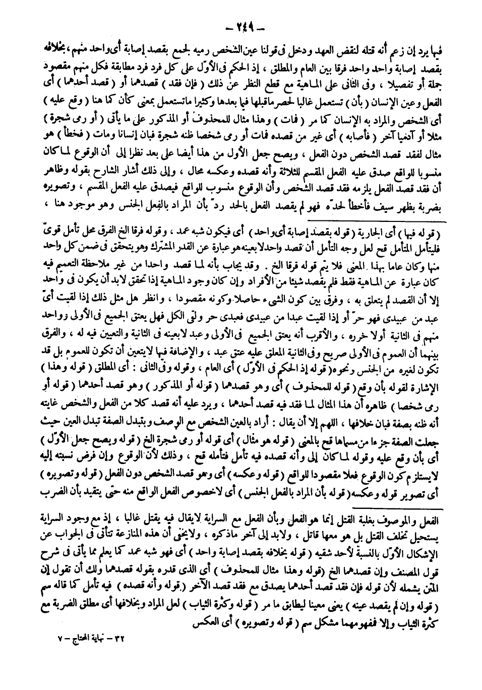 فِيهَا يَرِدُ إنْ زَعَمَ أَنَّهُ قَتَلَهُ لِنَقْضِ الْعَهْدِ وَدَخَلَ فِي قَوْلِنَا: عَيْنِ الشَّخْصِ رَمْيُهُ لِجَمْعٍ بِقَصْدِ إصَابَةِ أَيِّ وَاحِدٍ مِنْهُمْ، بِخِلَافِهِ بِقَصْدِ إصَابَةِ وَاحِدٍ وَاحِدٍ فَرْقًا بَيْنَ الْعَامِّ وَالْمُطْلَقِ؛ إذْ الْحُكْمُ فِي الْأَوَّلِ عَلَى كُلِّ فَرْدٍ فَرْدٍ مُطَابَقَةً فَكُلٌّ مِنْهُمْ مَقْصُودٌ جُمْلَةً أَوْ تَفْصِيلًا، وَفِي الثَّانِي عَلَى الْمَاهِيَّةِ مَعَ قَطْعِ النَّظَرِ عَنْ ذَلِكَ.