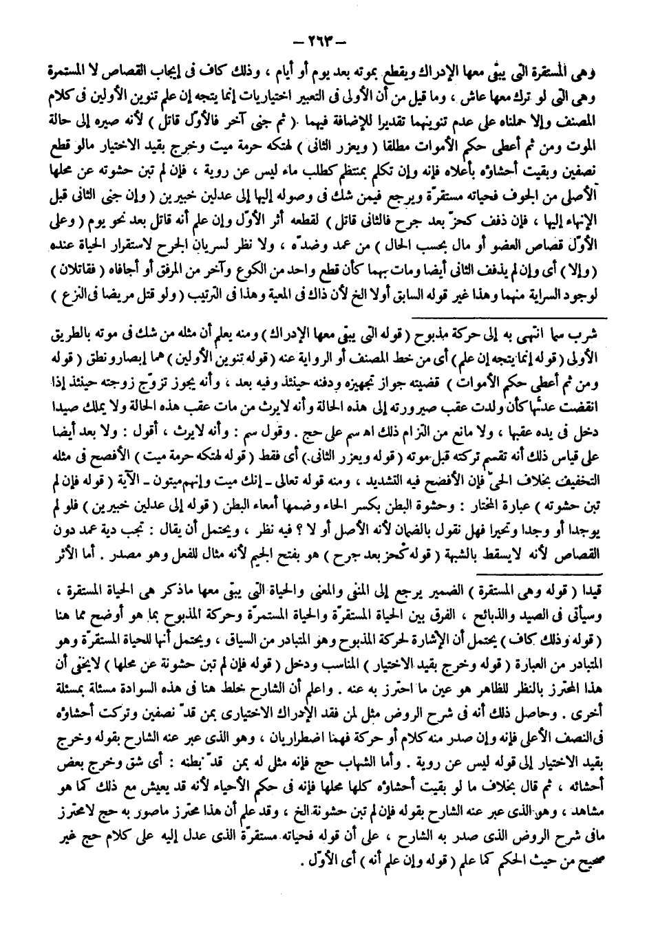 ـــــــــــــــــــــــــــــQقَيْدًا (قَوْلُهُ: وَهِيَ الْمُسْتَقِرَّةُ) الضَّمِيرُ يَرْجِعُ إلَى الْمَنْفِيِّ وَالْمَعْنَى وَالْحَيَاةُ الَّتِي يَبْقَى مَعَهَا مَا ذُكِرَ هِيَ الْحَيَاةُ الْمُسْتَقِرَّةُ، وَسَيَأْتِي فِي الصَّيْدِ وَالذَّبَائِحِ، الْفَرْقُ بَيْنَ الْحَيَاةِ الْمُسْتَقِرَّةِ وَالْحَيَاةِ الْمُسْتَمِرَّةِ وَحَرَكَةِ الْمَذْبُوحِ بِمَا هُوَ أَوْضَحُ مِمَّا هُنَا (قَوْلُهُ: وَذَلِكَ كَافٍ) يَحْتَمِلُ أَنَّ الْإِشَارَةَ لِحَرَكَةِ الْمَذْبُوحِ وَهُوَ الْمُتَبَادَرُ مِنْ السِّيَاقِ، وَيَحْتَمِلُ أَنَّهَا لِلْحَيَاةِ الْمُسْتَقِرَّةِ وَهُوَ الْمُتَبَادَرُ مِنْ الْعِبَارَةِ (قَوْلُهُ: وَخَرَجَ بِقَيْدِ الِاخْتِيَارِ) الْمُنَاسِبُ وَدَخَلَ (قَوْلُهُ: فَإِنْ لَمْ تَبِنْ حَشْوَتُهُ عَنْ مَحَلِّهَا) لَا يَخْفَى أَنَّ هَذَا الْمُحْتَرَزَ بِالنَّظَرِ لِلظَّاهِرِ هُوَ عَيْنُ مَا اُحْتُرِزَ بِهِ عَنْهُ.