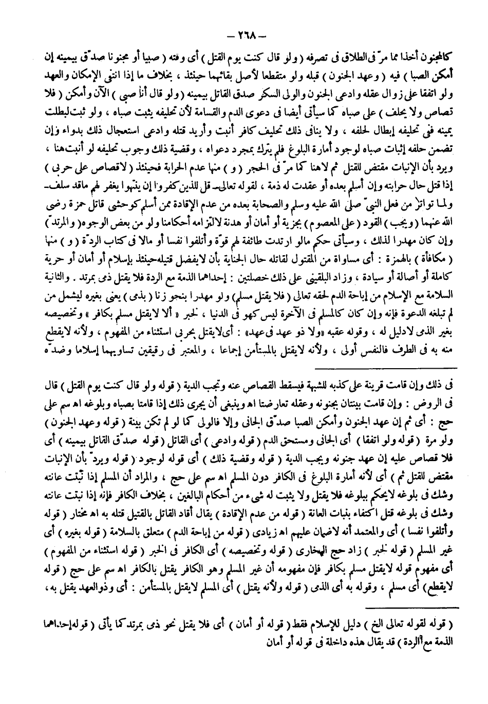 كَالْمَجْنُونِ أَخْذًا مِمَّا مَرَّ فِي الطَّلَاقِ فِي تَصَرُّفِهِ (وَلَوْ) (قَالَ كُنْت يَوْمَ الْقَتْلِ) أَيْ وَقْتَهُ (صَبِيًّا أَوْ مَجْنُونًا) (صُدِّقَ بِيَمِينِهِ إنْ أَمْكَنَ الصِّبَا) فِيهِ (وَعُهِدَ الْجُنُونُ) قَبْلَهُ وَلَوْ مُتَقَطِّعًا لِأَصْلِ بَقَائِهِمَا حِينَئِذٍ، بِخِلَافِ مَا إذَا انْتَفَى الْإِمْكَانُ وَالْعَهْدُ وَلَوْ اتَّفَقَا عَلَى زَوَالِ عَقْلِهِ وَادَّعَى الْجُنُونَ وَالْوَلِيُّ السُّكْرَ صُدِّقَ الْقَاتِلُ بِيَمِينِهِ (وَلَوْ قَالَ أَنَا صَبِيٌّ) الْآنَ وَأَمْكَنَ (فَلَا قِصَاصَ وَلَا يَحْلِفُ) عَلَى صِبَاهُ كَمَا سَيَأْتِي أَيْضًا فِي دَعْوَى الدَّمِ وَالْقَسَامَةِ؛ لِأَنَّ تَحْلِيفَهُ يُثْبِتُ صِبَاهُ، وَلَوْ ثَبَتَ لَبَطَلَتْ يَمِينُهُ فَفِي تَحْلِيفِهِ إبْطَالٌ لِحَلِفِهِ، وَلَا يُنَافِي ذَلِكَ تَحْلِيفَ كَافِرٍ أَنْبَتَ وَأُرِيدَ قَتْلُهُ وَادَّعَى اسْتِعْجَالَ ذَلِكَ بِدَوَاءٍ وَإِنْ تَضَمَّنَ حَلِفُهُ إثْبَاتَ صِبَاهُ لِوُجُودِ أَمَارَةِ الْبُلُوغِ فَلَمْ يُتْرَكْ بِمُجَرَّدِ دَعْوَاهُ، وَقَضِيَّةُ ذَلِكَ وُجُوبُ تَحْلِيفِهِ لَوْ أَنْبَتَ هُنَا، وَيُرَدُّ بِأَنَّ الْإِنْبَاتَ مُقْتَضٍ لِلْقَتْلِ ثَمَّ لَا هُنَا كَمَا مَرَّ فِي الْحَجْرِ (وَ) مِنْهَا عَدَمُ الْحِرَابَةِ فَحِينَئِذٍ (لَا قِصَاصَ عَلَى) (حَرْبِيٍّ) إذَا قُتِلَ حَالَ حِرَابَتِهِ وَإِنْ أَسْلَمَ بَعْدَهُ أَوْ عُقِدَتْ لَهُ ذِمَّةٌ لِقَوْلِهِ تَعَالَى {قُلْ لِلَّذِينَ كَفَرُوا إِنْ يَنْتَهُوا يُغْفَرْ لَهُمْ مَا قَدْ سَلَفَ} [الأنفال: 38] وَلِمَا تَوَاتَرَ مِنْ فِعْلِ النَّبِيِّ - صَلَّى اللَّهُ عَلَيْهِ وَسَلَّمَ - وَالصَّحَابَةِ بَعْدَهُ مِنْ عَدَمِ الْإِقَادَةِ مِمَّنْ أَسْلَمَ كَوَحْشِيٍّ قَاتِلِ حَمْزَةَ - رَضِيَ اللَّهُ عَنْهُمَا - (وَيَجِبُ) الْقَوَدُ (عَلَى الْمَعْصُومِ) بِجِزْيَةٍ أَوْ أَمَانٍ أَوْ هُدْنَةٍ لِالْتِزَامِهِ أَحْكَامَنَا، وَلَوْ مِنْ بَعْضِ الْوُجُوهِ (وَالْمُرْتَدِّ) وَإِنْ كَانَ مُهْدَرًا لِذَلِكَ، وَسَيَأْتِي حُكْمُ مَا لَوْ ارْتَدَّتْ طَائِفَةٌ لَهُمْ قُوَّةٌ وَأَتْلَفُوا نَفْسًا أَوْ مَالًا فِي كِتَابِ الرِّدَّةِ (وَ) مِنْهَا (مُكَافَأَةٌ) بِالْهَمْزَةِ: أَيْ مُسَاوَاةٌ مِنْ الْمَقْتُولِ لِقَاتِلِهِ حَالَ الْجِنَايَةِ بِأَنْ لَا يَفْضُلَ قَتِيلَهُ حِينَئِذٍ بِإِسْلَامٍ أَوْ أَمَانٍ أَوْ حُرِّيَّةٍ كَامِلَةٍ أَوْ أَصَالَةٍ أَوْ سِيَادَةٍ، وَزَادَ الْبُلْقِينِيُّ عَلَى ذَلِكَ خَصْلَتَيْنِ: إحْدَاهُمَا الذِّمَّةُ مَعَ الرِّدَّةِ فَلَا يُقْتَلُ ذِمِّيٌّ بِمُرْتَدٍّ.