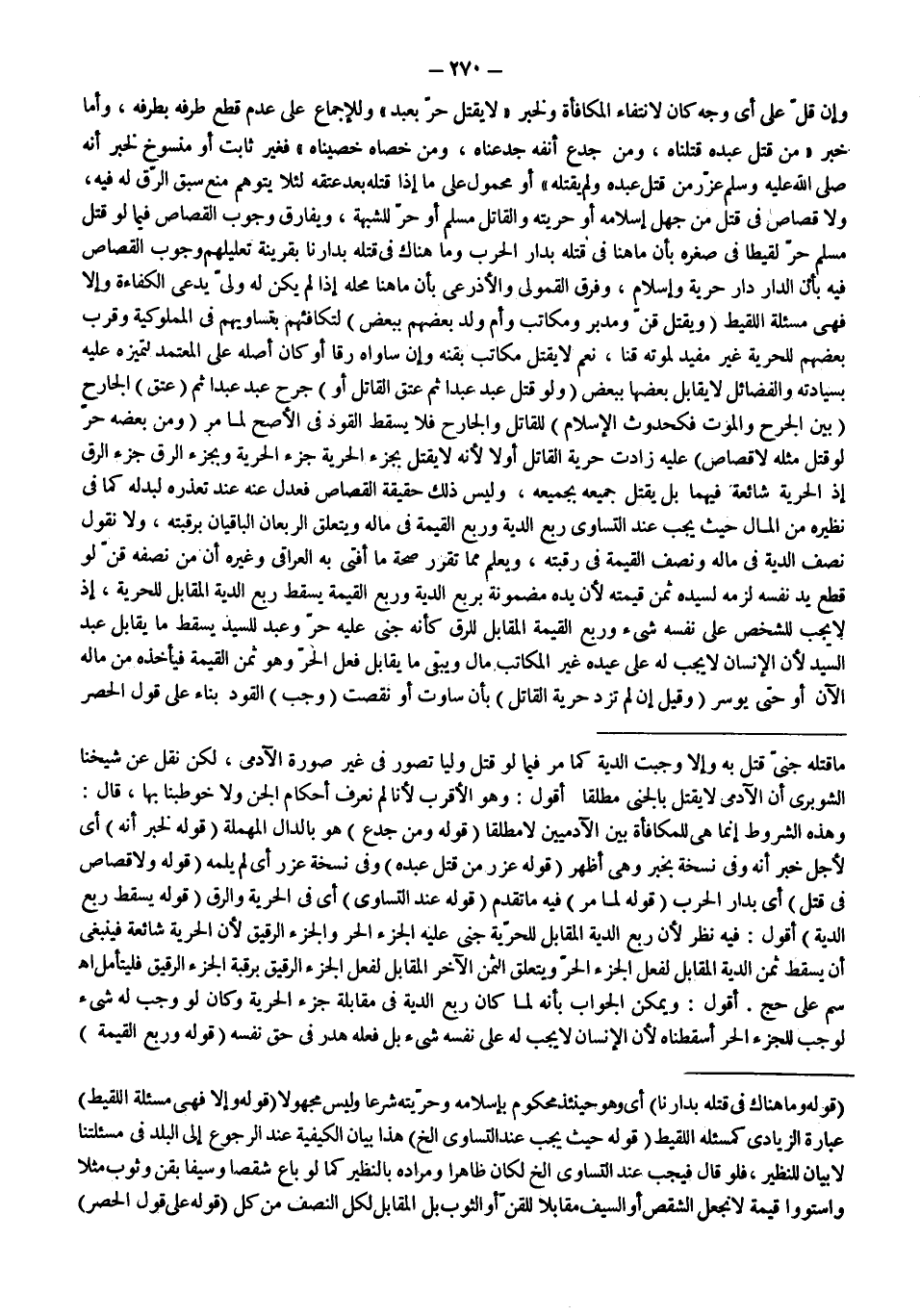 وَإِنْ قَلَّ عَلَى أَيِّ وَجْهٍ كَانَ لِانْتِفَاءِ الْمُكَافَأَةِ وَلِخَبَرِ «لَا يُقْتَلُ حُرٌّ بِعَبْدٍ» وَلِلْإِجْمَاعِ عَلَى عَدَمِ قَطْعِ طَرَفِهِ بِطَرَفِهِ، وَأَمَّا خَبَرُ «مَنْ قَتَلَ عَبْدَهُ قَتَلْنَاهُ، وَمَنْ جَدَعَ أَنْفَهُ جَدَعْنَاهُ، وَمَنْ خَصَاهُ خَصَيْنَاهُ» فَغَيْرُ ثَابِتٍ أَوْ مَنْسُوخٌ لِخَبَرِ «أَنَّهُ - صَلَّى اللَّهُ عَلَيْهِ وَسَلَّمَ - عَزَّرَ مَنْ قَتَلَ عَبْدَهُ وَلَمْ يَقْتُلْهُ» أَوْ مَحْمُولٌ عَلَى مَا إذَا قَتَلَهُ بَعْدَ عِتْقِهِ لِئَلَّا يُتَوَهَّمَ مَنْعُ سَبْقِ الرِّقِّ لَهُ فِيهِ، وَلَا قِصَاصَ فِي قَتْلِ مَنْ جَهِلَ إسْلَامَهُ أَوْ حُرِّيَّتَهُ وَالْقَاتِلُ مُسْلِمٌ أَوْ حُرٌّ لِلشُّبْهَةِ، وَيُفَارِقُ وُجُوبَ الْقِصَاصِ فِيمَا لَوْ قَتَلَ مُسْلِمٌ حُرٌّ لَقِيطًا فِي صِغَرِهِ بِأَنَّ مَا هُنَا فِي قَتْلِهِ بِدَارِ الْحَرْبِ وَمَا هُنَاكَ فِي قَتْلِهِ بِدَارِنَا بِقَرِينَةِ تَعْلِيلِهِمْ وُجُوبَ الْقِصَاصِ فِيهِ بِأَنَّ الدَّارَ دَارُ حُرِّيَّةٍ وَإِسْلَامٍ، وَفَرَّقَ الْقَمُولِيُّ وَالْأَذْرَعِيُّ بِأَنَّ مَا هُنَا مَحَلُّهُ إذَا لَمْ يَكُنْ لَهُ وَلِيٌّ يَدَّعِي الْكَفَاءَةَ وَإِلَّا فَهِيَ مَسْأَلَةُ اللَّقِيطِ (وَيُقْتَلُ قِنٌّ وَمُدَبَّرٌ وَمُكَاتَبٌ وَأُمُّ وَلَدٍ بَعْضُهُمْ بِبَعْضٍ) لِتَكَافُئِهِمْ بِتَسَاوِيهِمْ فِي الْمَمْلُوكِيَّةِ، وَقُرْبُ بَعْضِهِمْ لِلْحُرِّيَّةِ غَيْرُ مُفِيدٍ لِمَوْتِهِ قِنًّا، نَعَمْ لَا يُقْتَلُ مُكَاتَبٌ بِقِنِّهِ، وَإِنْ سَاوَاهُ رِقًّا أَوْ كَانَ أَصْلُهُ عَلَى الْمُعْتَمَدِ لِتَمَيُّزِهِ عَلَيْهِ بِسِيَادَتِهِ وَالْفَضَائِلُ لَا يُقَابَلُ بَعْضُهَا بِبَعْضٍ